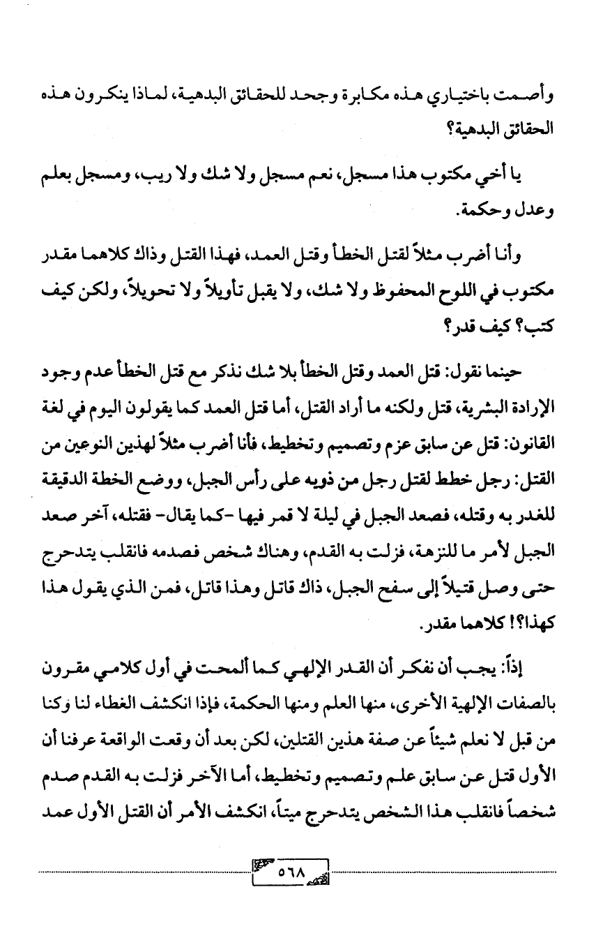 وأنا أضرب مثلاً لقتل الخطأ وقتل العمد، فهذا القتل وذاك كلاهما مقدر مكتوب في اللوح المحفوظ ولا شك، ولا يقبل تأويلاً ولا تحويلاً، ولكن كيف كتب؟ كيف قدر؟