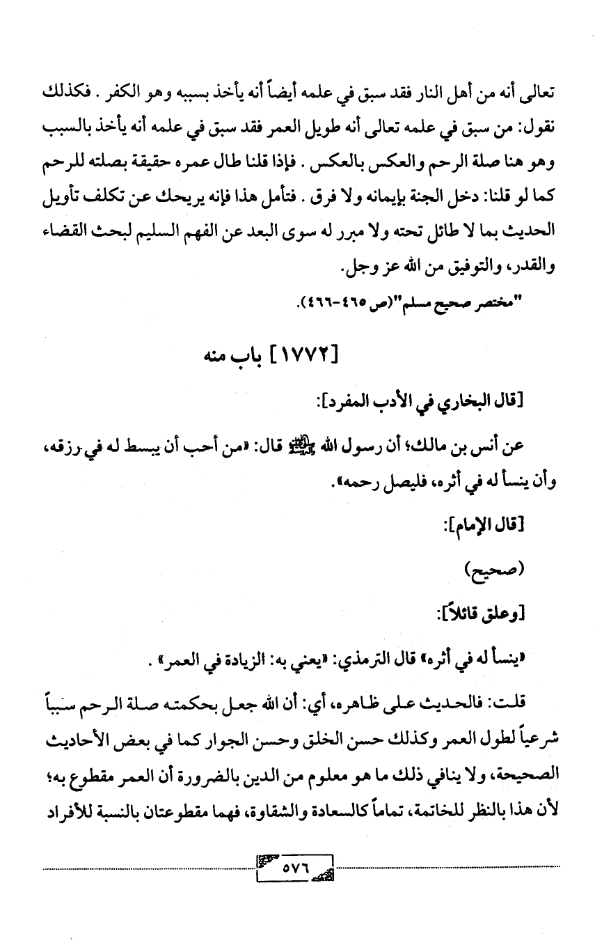 تعالى أنه من أهل النار فقد سبق في علمه أيضاً أنه يأخذ بسببه وهو الكفر. فكذلك نقول: من سبق في علمه تعالى أنه طويل العمر فقد سبق في علمه أنه يأخذ بالسبب وهو هنا صلة الرحم والعكس بالعكس. فإذا قلنا طال عمره حقيقة بصلته للرحم كما لو قلنا: دخل الجنة بإيمانه ولا فرق. فتأمل هذا فإنه يريحك عن تكلف تأويل الحديث بما لا طائل تحته ولا مبرر له سوى البعد عن الفهم السليم لبحث القضاء والقدر, والتوفيق من الله عز وجل.