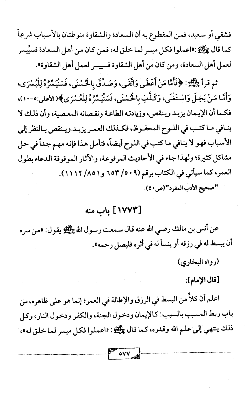 ثم قرأ - صلى الله عليه وآله وسلم -: {فَأَمَّا مَنْ أَعْطَى وَاتَّقَى، وَصَدَّقَ بِالْحُسْنَى، فَسَنُيَسِّرُهُ لِلْيُسْرَى، وَأَمَّا مَنْ بَخِلَ وَاسْتَغْنَى، وَكَذَّبَ بِالْحُسْنَى، فَسَنُيَسِّرُهُ لِلْعُسْرَى} (الأعلى:5 - 10)، فكما أن الإيمان يزيد وينقص، وزيادته الطاعة ونقصانه المعصية، وأن ذلك لا ينافي ما كتب في اللوح المحفوظ، فكذلك العمر يزيد وينقص بالنظر إلى الأسباب فهو لا ينافي ما كتب في اللوح أيضاً، فتأمل هذا فإنه مهم جداً في حل مشاكل كثيرة؛ ولهذا جاء في الأحاديث المرفوعة، والآثار الموقوفة الدعاء بطول العمر، كما سيأتي في الكتاب برقم (509/ 653 و851/ 1112).