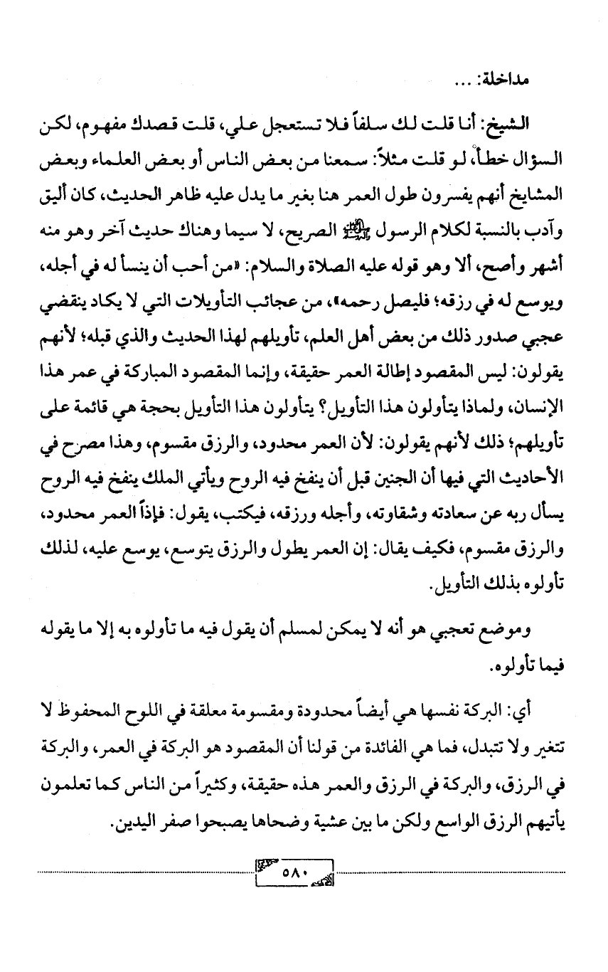 الشيخ: أنا قلت لك سلفاً فلا تستعجل علي، قلت قصدك مفهوم، لكن السؤال خطأ، لو قلت مثلاً: سمعنا من بعض الناس أو بعض العلماء وبعض المشايخ أنهم يفسرون طول العمر هنا بغير ما يدل عليه ظاهر الحديث، كان أليق وآدب بالنسبة لكلام الرسول - صلى الله عليه وآله وسلم - الصريح، لا سيما وهناك حديث آخر وهو منه أشهر وأصح، ألا وهو قوله عليه الصلاة والسلام: «من أحب أن ينسأ له في أجله، ويوسع له في رزقه؛ فليصل رحمه»، من عجائب التأويلات التي لا يكاد ينقضي عجبي صدور ذلك من بعض أهل العلم، تأويلهم لهذا الحديث والذي قبله؛ لأنهم يقولون: ليس المقصود إطالة العمر حقيقة، وإنما المقصود المباركة في عمر هذا الإنسان، ولماذا يتأولون هذا التأويل؟ يتأولون هذا التأويل بحجة هي قائمة على تأويلهم؛ ذلك لأنهم يقولون: لأن العمر محدود، والرزق مقسوم، وهذا مصرح في الأحاديث التي فيها أن الجنين قبل أن ينفخ فيه الروح ويأتي الملك ينفخ فيه الروح يسأل ربه عن سعادته وشقاوته، وأجله ورزقه، فيكتب، يقول: فإذاً العمر محدود، والرزق مقسوم، فكيف يقال: إن العمر يطول والرزق يتوسع، يوسع عليه، لذلك تأولوه بذلك التأويل.