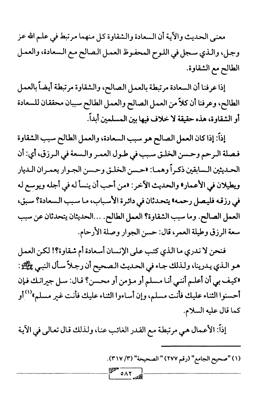 إذاً: إذا كان العمل الصالح هو سبب السعادة، والعمل الطالح سبب الشقاوة فصلة الرحم وحسن الخلق سبب في طول العمر والسعة في الرزق، أي: أن الحديثين السابقين ذكراً وهما: «حسن الخلق وحسن الجوار يعمران الديار ويطيلان في الأعمار» والحديث الآخر: «من أحب أن ينسأ له في أجله ويوسع له في رزقه فليصل رحمه» يتحدثان في دائرة الأسباب، ما سبب السعادة؟ سبق، العمل الصالح. وما سبب الشقاوة؟ العمل الطالح. ... الحديثان يتحدثان عن سبب سعة الرزق وطيلة العمر، قال: حسن الجوار وصلة الأرحام.