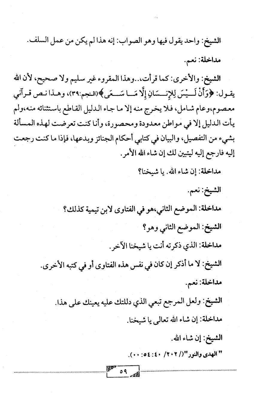 الشيخ: والأخرى: كما قرأت، .. وهذا المقروء غير سليم ولا صحيح، لأن الله يقول: {وَأَنْ لَيْسَ لِلإِنسَانِ إِلَّا مَا سَعَى} (النجم:39)، وهذا نص قرآني معصوم، وعام شامل، فلا يخرج منه إلا ما جاء الدليل القاطع باستثنائه منه، ولم يأت الدليل إلا في مواطن معدودة ومحصورة، وأنا كنت تعرضت لهذه المسألة بشيء من التفصيل، والبيان في كتابي أحكام الجنائز وبدعها، فإذا ما كنت رجعت إليه فارجع إليه ليتبين لك إن شاء الله الأمر.