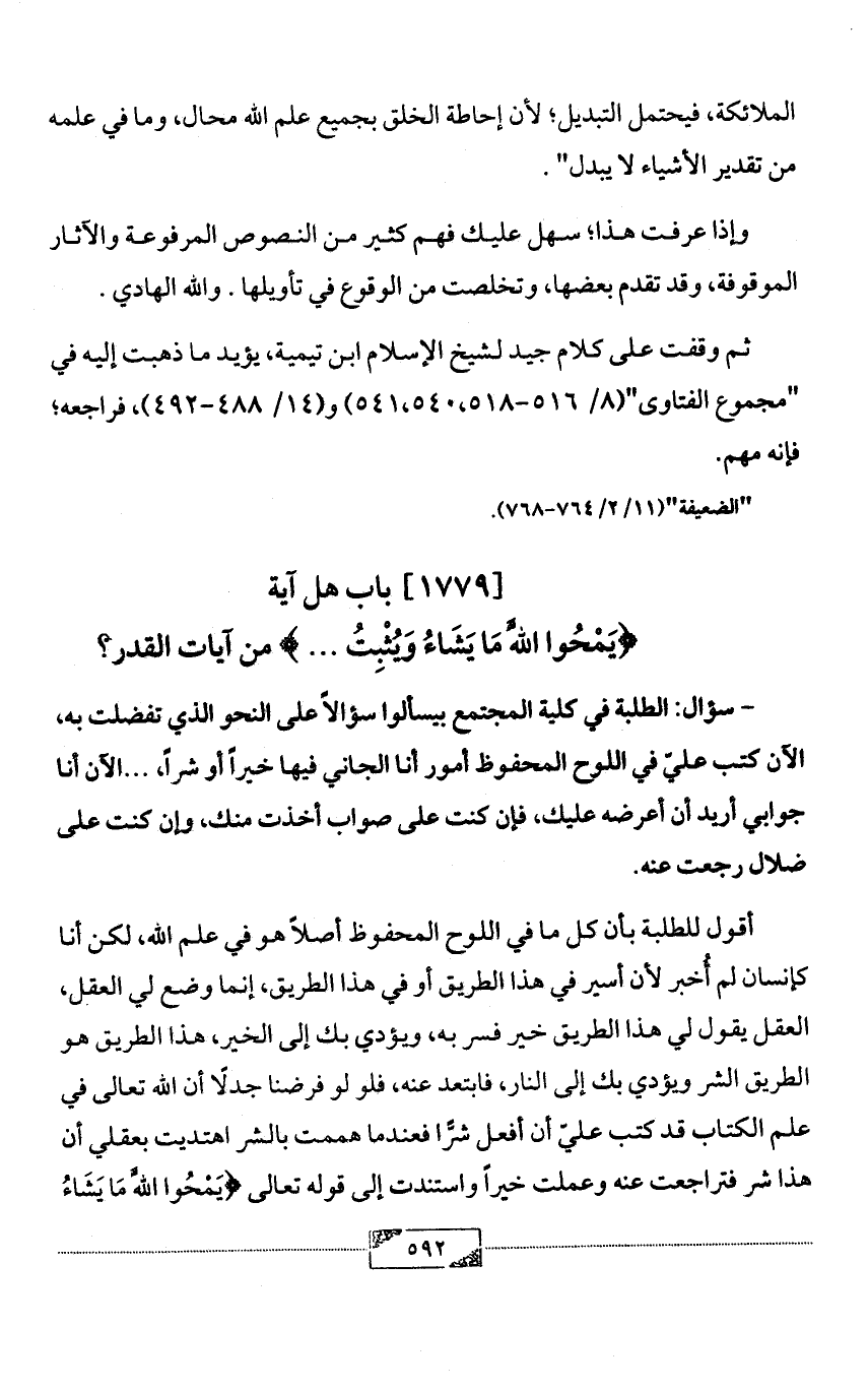 أقول للطلبة بأن كل ما في اللوح المحفوظ أصلاً هو في علم الله, لكن أنا كإنسان لم أُخبر لأن أسير في هذا الطريق أو في هذا الطريق, إنما وضع لي العقل, العقل يقول لي هذا الطريق خير فسر به, ويؤدي بك إلى الخير, هذا الطريق هو الطريق الشر ويؤدي بك إلى النار, فابتعد عنه, فلو لو فرضنا جدلًا أن الله تعالى في علم الكتاب قد كتب عليّ أن أفعل شرًّا فعندما هممت بالشر اهتديت بعقلي أن هذا شر فتراجعت عنه وعملت خيراً واستندت إلى قوله تعالى {يَمْحُوا اللَّهُ مَا يَشَاءُ