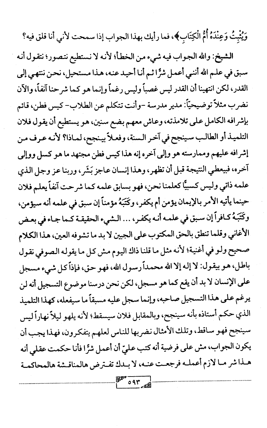 الشيخ: والله الجواب فيه شيء من الخطأ؛ لأنه لا نستطيع نتصور؛ نتقول أنه سبق في علم الله أنني أعمل شرًّا ثم أنا أحيد عنه, هذا مستحيل, نحن ننتهي إلى القدر, لكن انتهينا أن القدر ليس غصباً وليس رغماً وإنما هو كما شرحنا آنفاً, والآن نضرب مثلاً توضيحيّاً: مدير مدرسة -وأنت تتكلم عن الطلاب- كيس فطن, قائم بإشرافه الكامل على تلامذته, وعاش معهم بضع سنين, هو يستطيع أن يقول فلان التلميذ أو الطالب سينجح في آخر السنة, وفعلاً بينجح, لماذا؟ لأنه عرف من إشرافه عليهم وممارسته هو وإلى آخره إنه هذا كيس فطن مجتهد ما هو كسل ووإلى آخره, فبيعطي النتيجة قبل أن تظهر, وهذا إنسان عاجز بَشَر, وربنا عز وجل الذي علمه ذاتي وليس كسبيًّا كعلمنا نحن, فهو بسابق علمه كما شرحت آنفاً يعلم فلان حينما يأتيه الأمر بالإيمان يؤمن أم يكفر, وكَتَبَهُ مؤمناً إن سبق في علمه أنه سيؤمن, وكَتَبَهُ كافراً إن سبق في علمه أنه يكفر, ... الشيء الحقيقة كما جاء في بعض الأغاني وقلما تنطق بالحق المكتوب على الجبين لا بد ما تشوفه العين, هذا الكلام صحيح ولو في أغنية؛ لأنه مثل ما قلنا ذاك اليوم مش كل ما يقوله الصوفي نقول باطل, هو بيقول: لا إله إلا الله محمداً رسول الله, فهو حق, فإذاً كل شيء مسجل على الإنسان لا بد أن يقع كما هو مسجل, لكن نحن درسنا موضوع التسجيل أنه لن يرغم على هذا التسجيل صاحبه, وإنما سجل عليه مسبقاً ما سيفعله, كهذا التلميذ الذي حكم أستاذه بأنه سينجح, وبالمقابل فلان سيسقط؛ لأنه يلهو ليلاً نهاراً ليس سينجح فهو ساقط, وتلك الأمثال نضربها للناس لعلهم يتفكرون, فهذا يجب أن يكون الجواب, مش على فرضية أنه كتب عليّ أن أعمل شرًّا فأنا حكمت عقلي أنه هذا شر ما لازم أعمله فرجعت عنه, لا بدك تفترض هالمناقشة هالمحاكمة