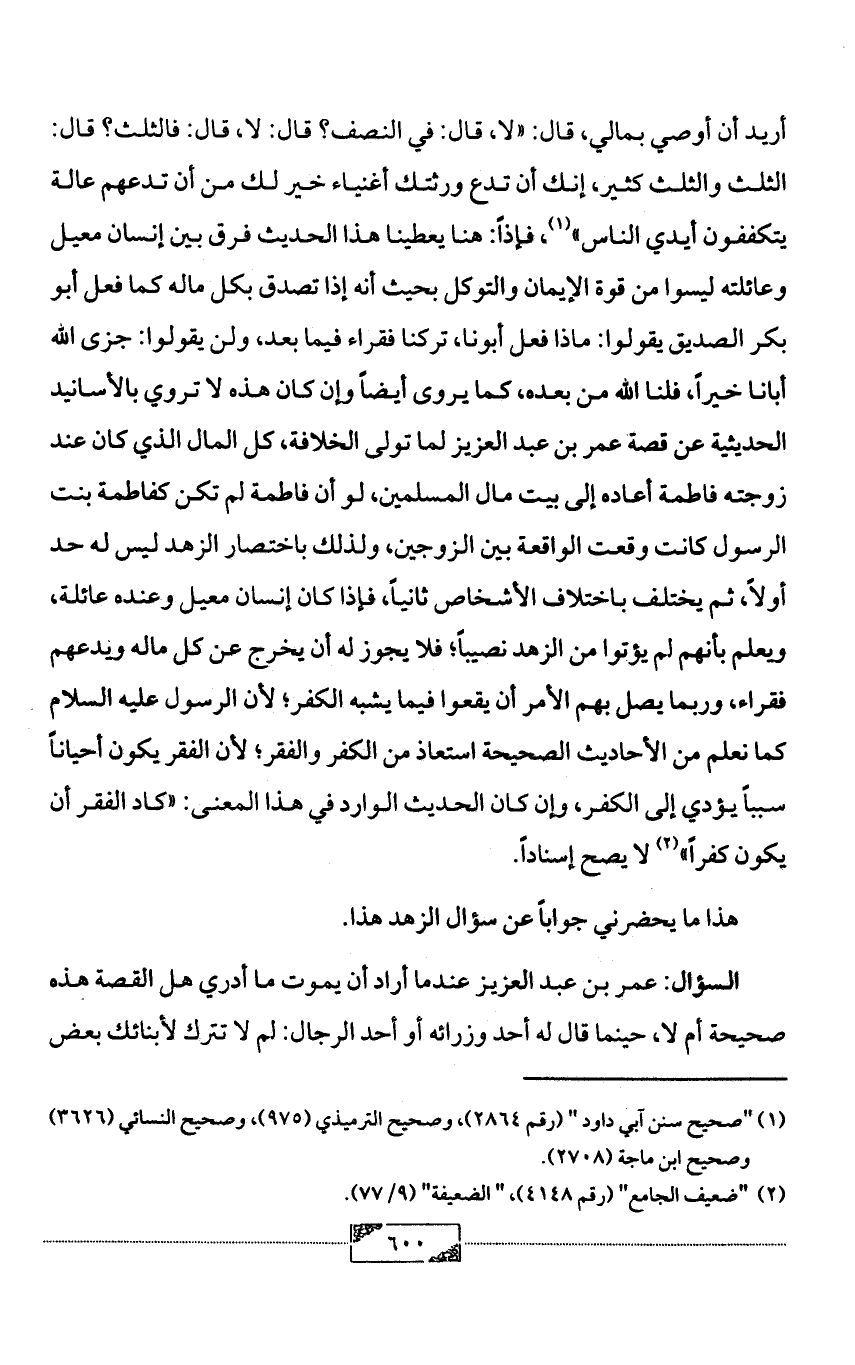 أريد أن أوصي بمالي، قال: «لا، قال: في النصف؟ قال: لا، قال: فالثلث؟ قال: الثلث والثلث كثير، إنك أن تدع ورثتك أغنياء خير لك من أن تدعهم عالة يتكففون أيدي الناس» (¬1)، فإذاً: هنا يعطينا هذا الحديث فرق بين إنسان معيل وعائلته ليسوا من قوة الإيمان والتوكل بحيث أنه إذا تصدق بكل ماله كما فعل أبو بكر الصديق يقولوا: ماذا فعل أبونا، تركنا فقراء فيما بعد، ولن يقولوا: جزى الله أبانا خيراً، فلنا الله من بعده، كما يروى أيضاً وإن كان هذه لا تروي بالأسانيد الحديثية عن قصة عمر بن عبد العزيز لما تولى الخلافة، كل المال الذي كان عند زوجته فاطمة أعاده إلى بيت مال المسلمين، لو أن فاطمة لم تكن كفاطمة بنت الرسول كانت وقعت الواقعة بين الزوجين، ولذلك باختصار الزهد ليس له حد أولاً، ثم يختلف باختلاف الأشخاص ثانياً، فإذا كان إنسان معيل وعنده عائلة، ويعلم بأنهم لم يؤتوا من الزهد نصيباً؛ فلا يجوز له أن يخرج عن كل ماله ويدعهم فقراء، وربما يصل بهم الأمر أن يقعوا فيما يشبه الكفر؛ لأن الرسول عليه السلام كما نعلم من الأحاديث الصحيحة استعاذ من الكفر والفقر؛ لأن الفقر يكون أحياناً سبباً يؤدي إلى الكفر، وإن كان الحديث الوارد في هذا المعنى: «كاد الفقر أن يكون كفراً» (¬2) لا يصح إسناداً.