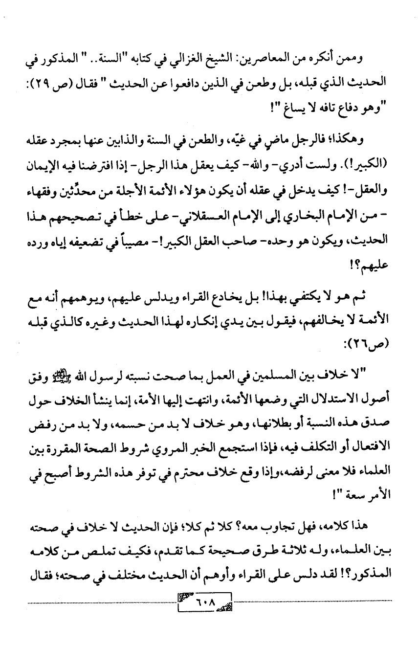 وهكذا؛ فالرجل ماضٍ في غيّه، والطعن في السنة والذابين عنها بمجرد عقله (الكبير!). ولست أدري- والله- كيف يعقل هذا الرجل- إذا افترضنا فيه الإيمان والعقل-! كيف يدخل في عقله أن يكون هؤلاء الأئمة الأجلة من محدِّثين وفقهاء - من الإمام البخاري إلى الإمام العسقلاني- على خطأ في تصحيحهم هذا الحديث، ويكون هو وحده- صاحب العقل الكبير! - مصيباً في تضعيفه إياه ورده عليهم؟!