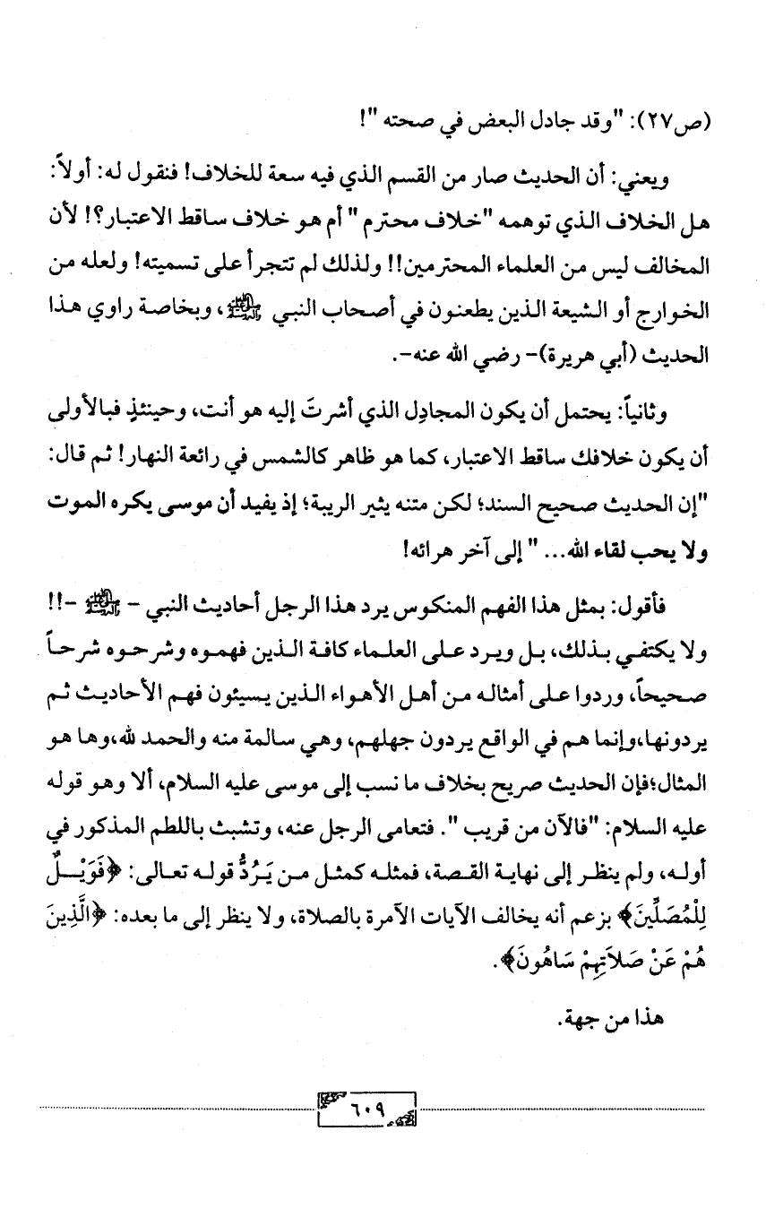 ويعني: أن الحديث صار من القسم الذي فيه سعة للخلاف! فنقول له: أولاً: هل الخلاف الذي توهمه "خلاف محترم " أم هو خلاف ساقط الاعتبار؟! لأن المخالف ليس من العلماء المحترمين!! ولذلك لم تتجرأ على تسميته! ولعله من الخوارج أو الشيعة الذين يطعنون في أصحاب النبي - صلى الله عليه وآله وسلم -، وبخاصة راوي هذا الحديث (أبي هريرة) - رضي الله عنه-.