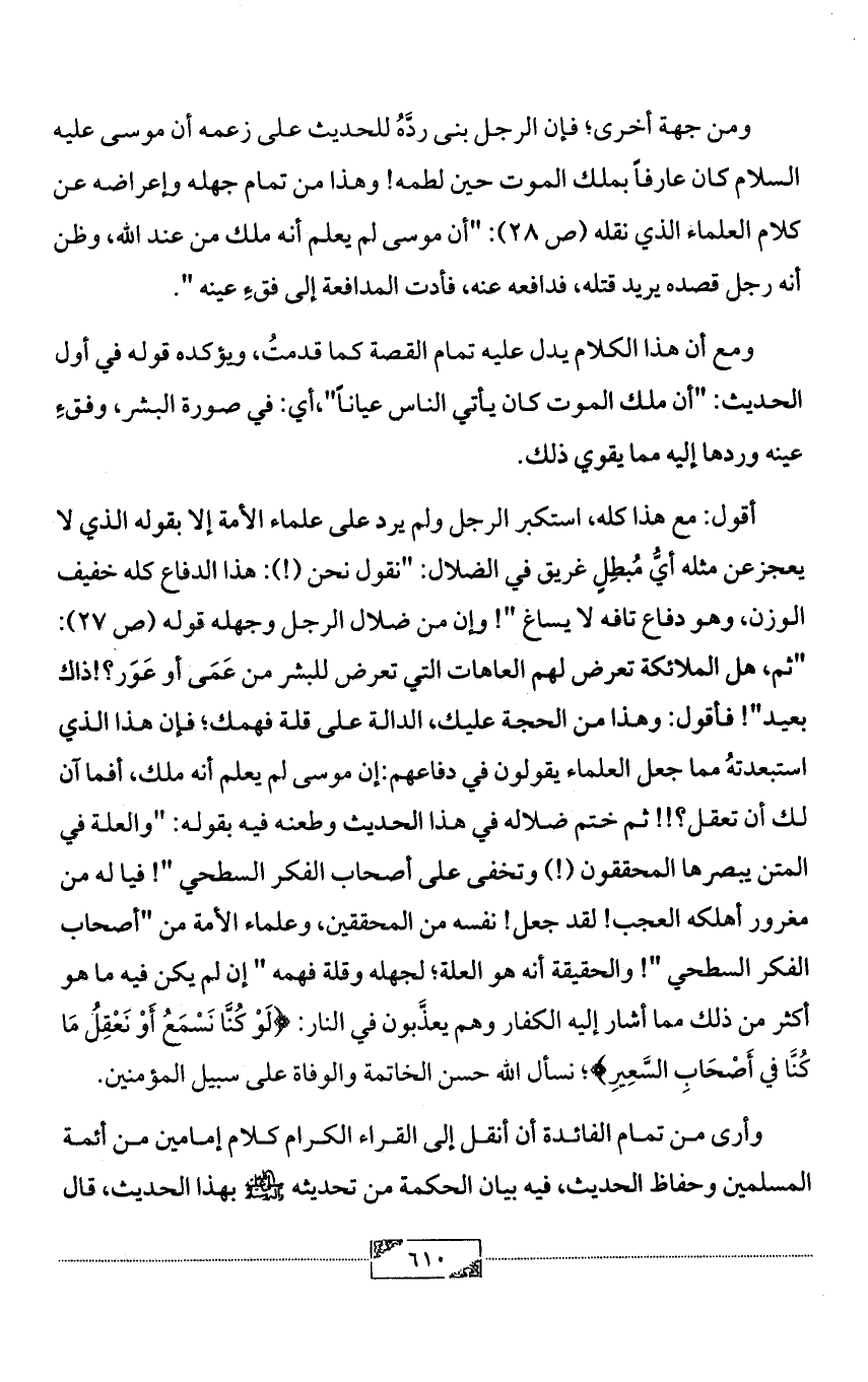 أقول: مع هذا كله، استكبر الرجل ولم يرد على علماء الأمة إلا بقوله الذي لا يعجزعن مثله أيُّ مُبطِلٍ غريق في الضلال: "نقول نحن (!): هذا الدفاع كله خفيف الوزن، وهو دفاع تافه لا يساغ "! وإن من ضلال الرجل وجهله قوله (ص 27): "ثم، هل الملائكة تعرض لهم العاهات التي تعرض للبشر من عَمَى أو عَوَر؟! ذاك بعيد"! فأقول: وهذا من الحجة عليك، الدالة على قلة فهمك؛ فإن هذا الذي استبعدتهُ مما جعل العلماء يقولون في دفاعهم: إن موسى لم يعلم أنه ملك، أفما آن لك أن تعقل؟!! ثم ختم ضلاله في هذا الحديث وطعنه فيه بقوله: "والعلة في المتن يبصرها المحققون (!) وتخفى على أصحاب الفكر السطحي "! فيا له من مغرور أهلكه العجب! لقد جعل! نفسه من المحققين، وعلماء الأمة من "أصحاب الفكر السطحي "! والحقيقة أنه هو العلة؛ لجهله وقلة فهمه " إن لم يكن فيه ما هو أكثر من ذلك مما أشار إليه الكفار وهم يعذَّبون في النار: {لَوْ كُنَّا نَسْمَعُ أَوْ نَعْقِلُ مَا كُنَّا في أَصْحَابِ السَّعِيرِ}؛ نسأل الله حسن الخاتمة والوفاة على سبيل المؤمنين.