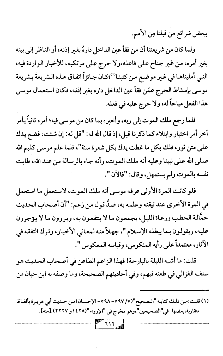 فلو كانت المرة الأولى عرفه موسى أنه ملك الموت، لاستعمل ما استعمل في المرة الأخرى عند تيقنه وعلمه به، ضدَّ قول من زعم: "أن أصحاب الحديث حمَّالة الحطب ورعاة الليل، يجمعون ما لا ينتفعون به، ويروون ما لا يؤجرون عليه، ويقولون بما يبطله الإسلام "، جهلاً منه لمعاني الأخبار، وترك التفقه في الآثار، معتمداً على رأيه المنكوس، وقياسه المعكوس ".