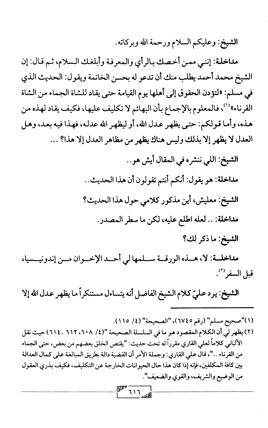 (¬2) يظهر لي أن الكلام المقصود هو ما في السلسلة الصحيحة " (4/ 608, 612 ـ 614) حيث نقل الألباني كلاماً لعلي القاري مقرراً له تحت حديث: "يقتص الخلق بعضهم من بعض, حتى الجماء من القرناء .. ", قال علي القاري: وجملة الأمر أن القضية دالة بطريق المبالغة على كمال العدالة بين كافة المكلفين, فإنه إذا كان هذا حال الحيوانات الخارجة عن التكليف, فكيف بذري العقول من الوضيع والشريف, والقوي والضعيف".