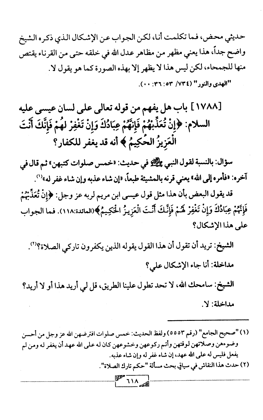 [1788] باب هل يفهم من قوله تعالى على لسان عيسى عليه السلام: {إِنْ تُعَذِّبْهُمْ فَإِنَّهُمْ عِبَادُكَ وَإِنْ تَغْفِرْ لَهُمْ فَإِنَّكَ أَنْتَ الْعَزِيزُ الْحَكِيمُ} أنه قد يغفر للكفار؟