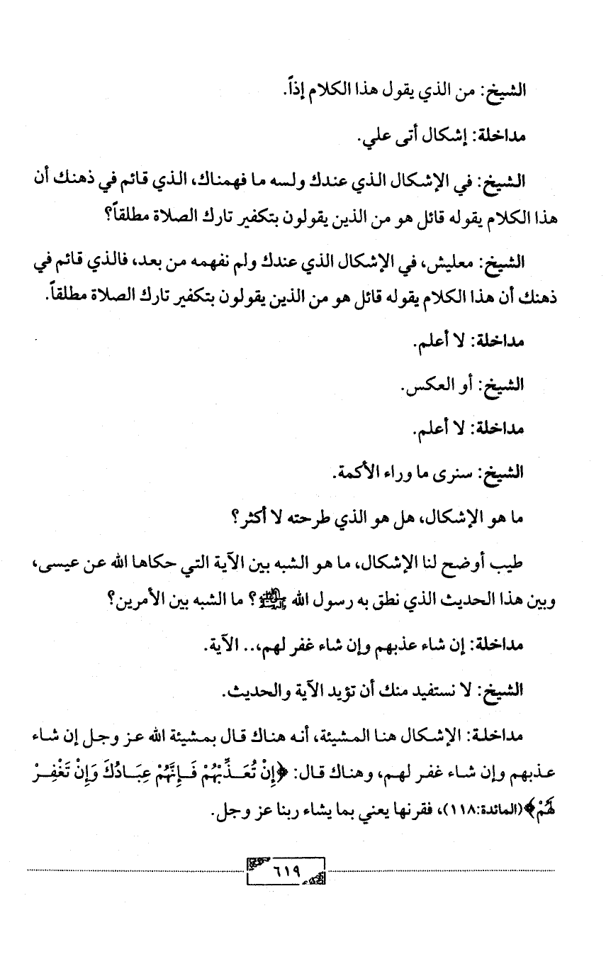 الشيخ: معليش، في الإشكال الذي عندك ولم نفهمه من بعد، فالذي قائم في ذهنك أن هذا الكلام يقوله قائل هو من الذين يقولون بتكفير تارك الصلاة مطلقاً.