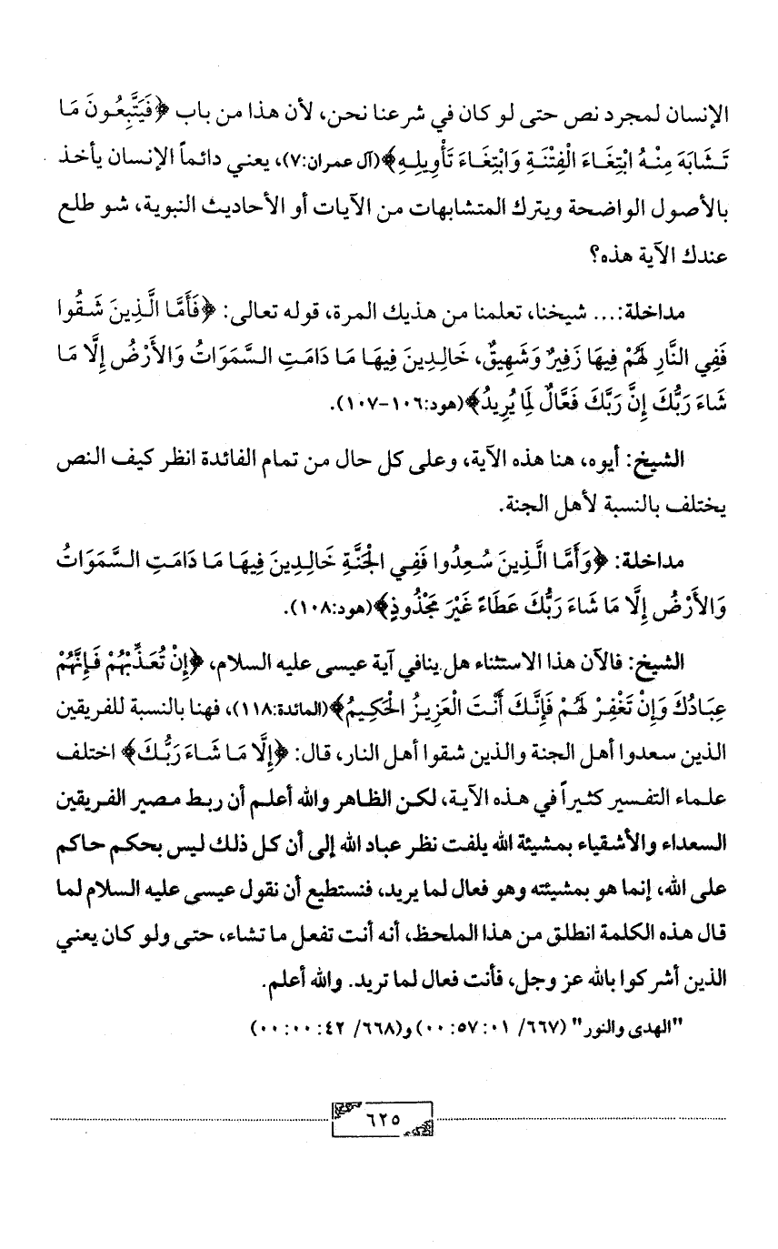 الشيخ: فالآن هذا الاستثناء هل ينافي آية عيسى عليه السلام، {إِنْ تُعَذِّبْهُمْ فَإِنَّهُمْ عِبَادُكَ وَإِنْ تَغْفِرْ لَهُمْ فَإِنَّكَ أَنْتَ الْعَزِيزُ الْحَكِيمُ} (المائدة:118)، فهنا بالنسبة للفريقين الذين سعدوا أهل الجنة والذين شقوا أهل النار، قال: {إِلَّا مَا شَاءَ رَبُّكَ} اختلف علماء التفسير كثيراً في هذه الآية، لكن الظاهر والله أعلم أن ربط مصير الفريقين السعداء والأشقياء بمشيئة الله يلفت نظر عباد الله إلى أن كل ذلك ليس بحكم حاكم على الله، إنما هو بمشيئته وهو فعال لما يريد، فنستطيع أن نقول عيسى عليه السلام لما قال هذه الكلمة انطلق من هذا الملحظ، أنه أنت تفعل ما تشاء، حتى ولو كان يعني الذين أشركوا بالله عز وجل، فأنت فعال لما تريد. والله أعلم.