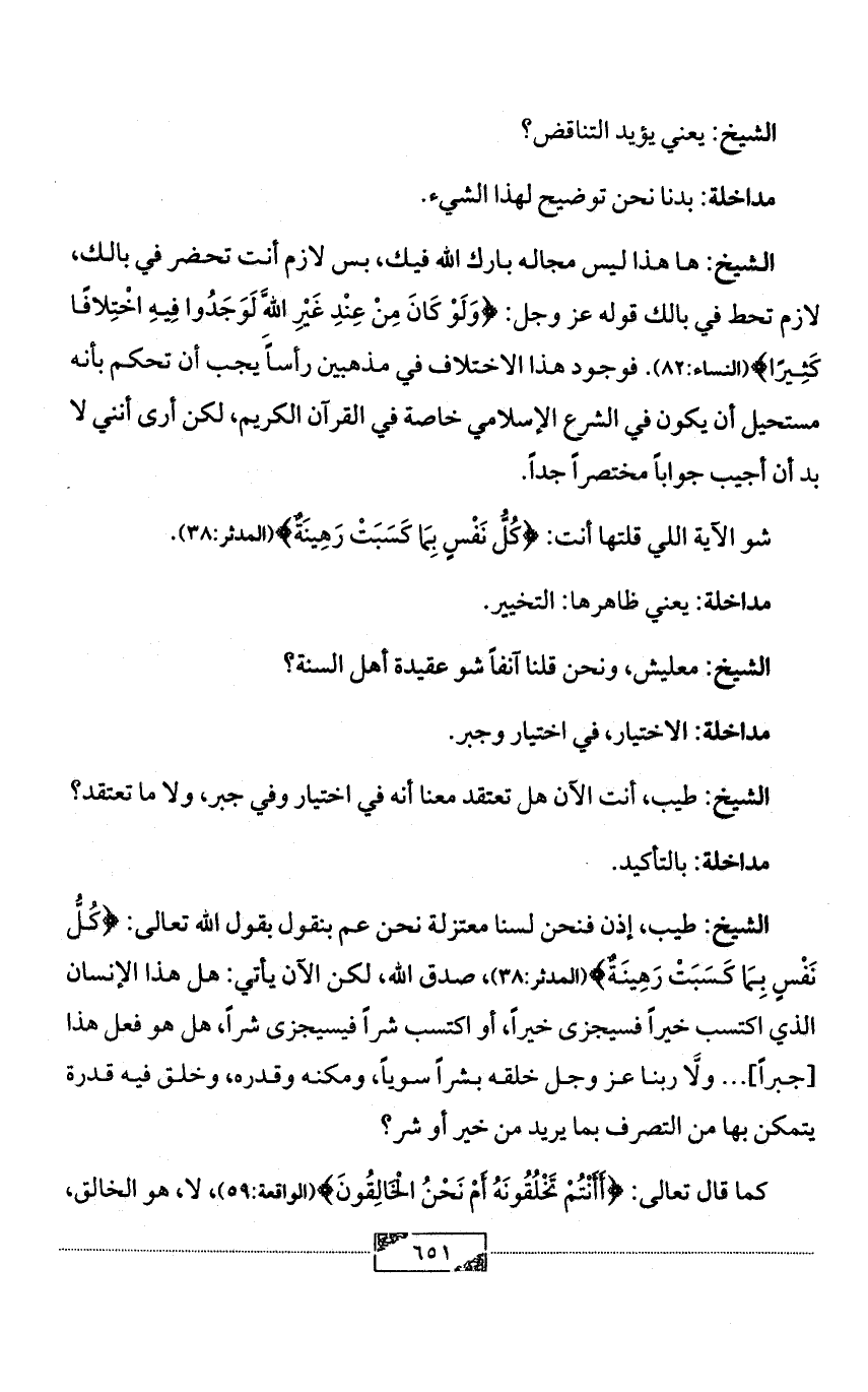 الشيخ: طيب، إذن فنحن لسنا معتزلة نحن عم بنقول بقول الله تعالى: {كُلُّ نَفْسٍ بِمَا كَسَبَتْ رَهِينَةٌ} (المدثر:38)، صدق الله، لكن الآن يأتي: هل هذا الإنسان الذي اكتسب خيراً فسيجزى خيراً، أو اكتسب شراً فيسيجزى شراً، هل هو فعل هذا [جبراً] ... ولَّا ربنا عز وجل خلقه بشراً سوياً، ومكنه وقدره، وخلق فيه قدرة يتمكن بها من التصرف بما يريد من خير أو شر؟