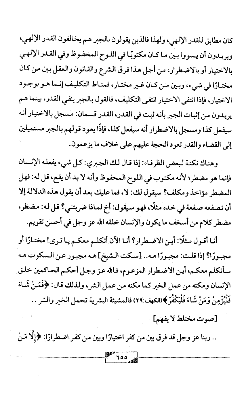 أنا أقول مثلًا: أين الاضطرار؟ أنا الآن أتكلم معكم يا ترى! مختارًا أو مجبورًا؟ إذا قلت: مجبورًا هه .. [سكت الشيخ] هه مجبور عن السكوت هه سأتكلم معكم، أين الاضطرار المزعوم، فالله عز وجل أحكم الحاكمين خلق الإنسان ومكنه من عمل الخير كما مكنه من عمل الشر، ولذلك قال: {فَمَنْ شَاءَ فَلْيُؤْمِنْ وَمَنْ شَاءَ فَلْيَكْفُرْ} (الكهف:29) فالمشيئة البشرية تحمل الخير والشر ..