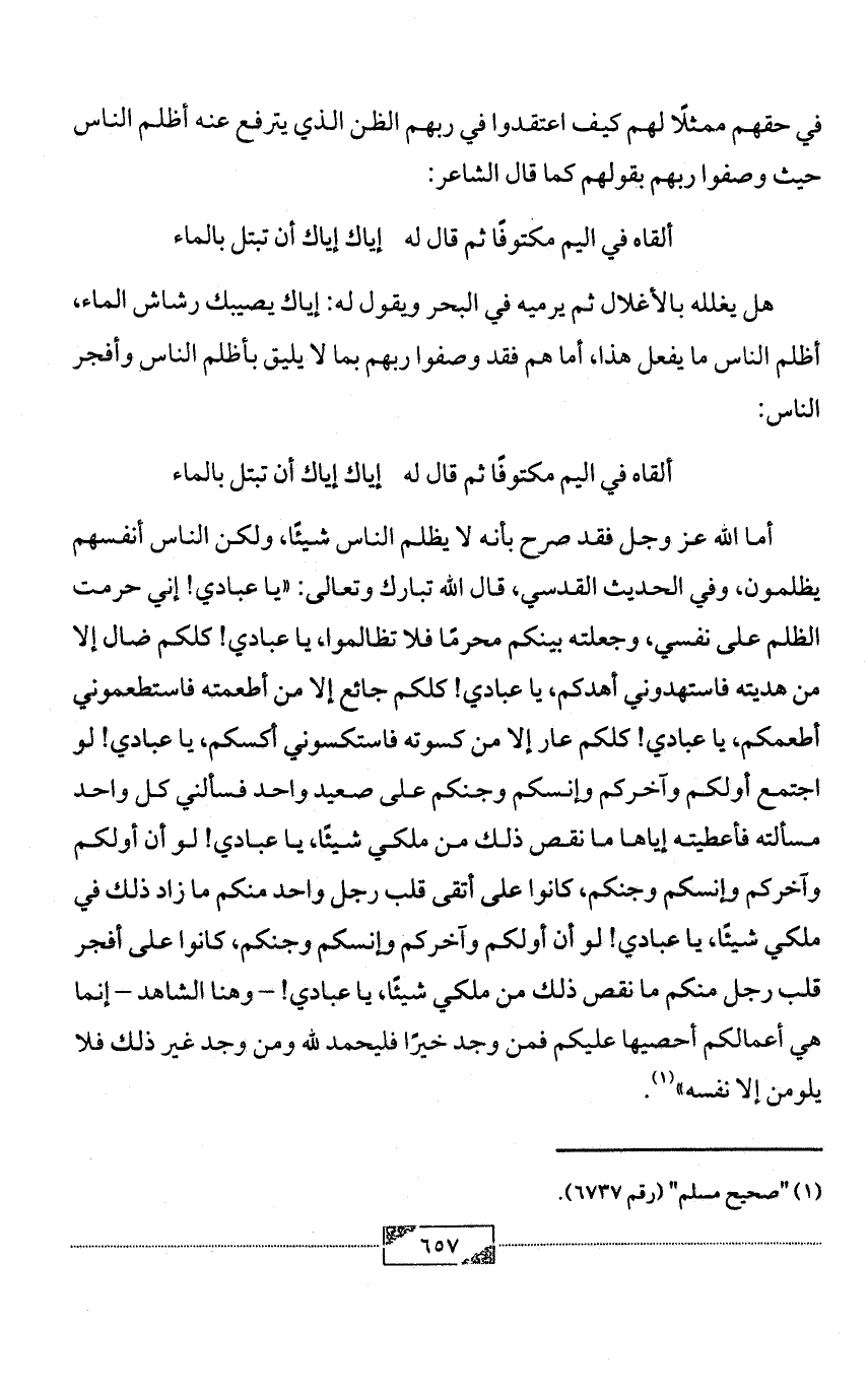 أما الله عز وجل فقد صرح بأنه لا يظلم الناس شيئًا، ولكن الناس أنفسهم يظلمون، وفي الحديث القدسي، قال الله تبارك وتعالى: «يا عبادي! إني حرمت الظلم على نفسي، وجعلته بينكم محرمًا فلا تظالموا، يا عبادي! كلكم ضال إلا من هديته فاستهدوني أهدكم، يا عبادي! كلكم جائع إلا من أطعمته فاستطعموني أطعمكم، يا عبادي! كلكم عار إلا من كسوته فاستكسوني أكسكم، يا عبادي! لو اجتمع أولكم وآخركم وإنسكم وجنكم على صعيد واحد فسألني كل واحد مسألته فأعطيته إياها ما نقص ذلك من ملكي شيئًا، يا عبادي! لو أن أولكم وآخركم وإنسكم وجنكم، كانوا على أتقى قلب رجل واحد منكم ما زاد ذلك في ملكي شيئًا، يا عبادي! لو أن أولكم وآخركم وإنسكم وجنكم، كانوا على أفجر قلب رجل منكم ما نقص ذلك من ملكي شيئًا، يا عبادي! - وهنا الشاهد - إنما هي أعمالكم أحصيها عليكم فمن وجد خيرًا فليحمد لله ومن وجد غير ذلك فلا يلومن إلا نفسه» (¬1).