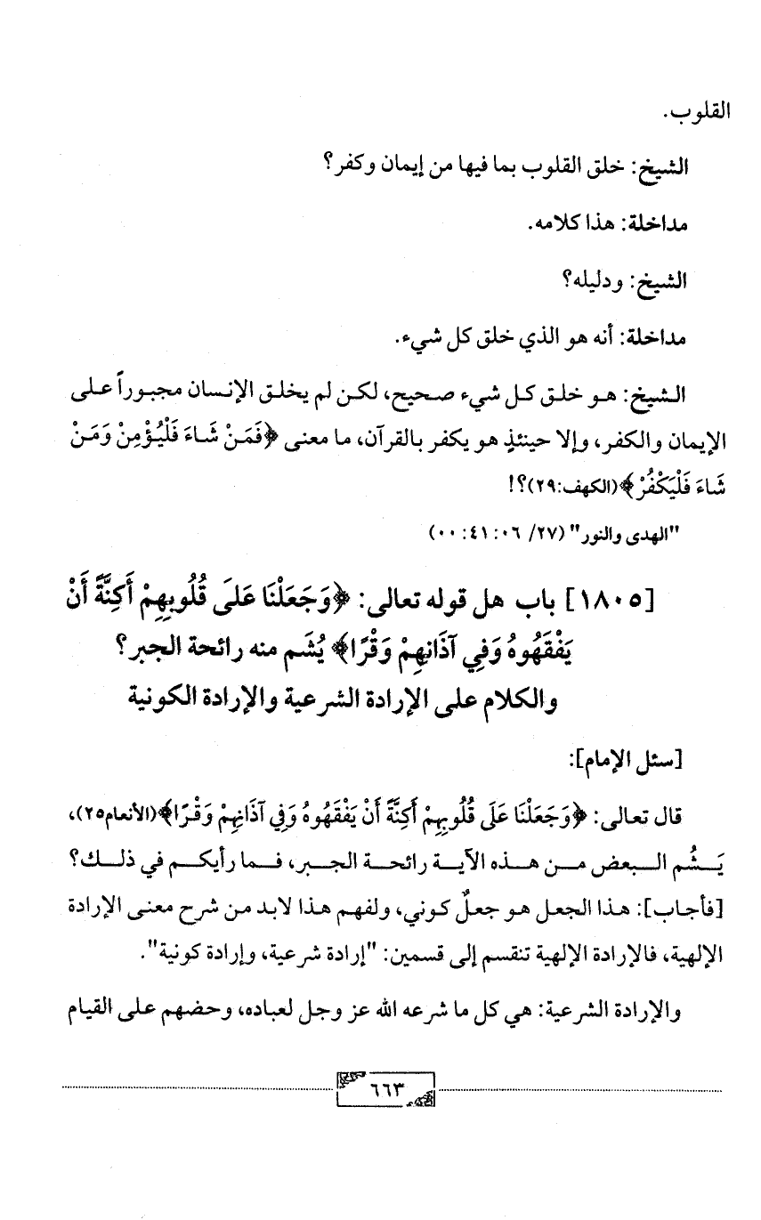 [1805] باب هل قوله تعالى: {وَجَعَلْنَا عَلَى قُلُوبِهِمْ أَكِنَّةً أَنْ يَفْقَهُوهُ وَفِي آذَانِهِمْ وَقْرًا} يُشَم منه رائحة الجبر؟ والكلام على الإرادة الشرعية والإرادة الكونية