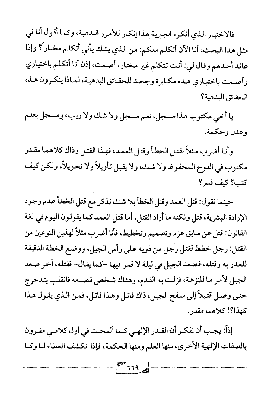 وأنا أضرب مثلاً لقتل الخطأ وقتل العمد، فهذا القتل وذاك كلاهما مقدر مكتوب في اللوح المحفوظ ولا شك، ولا يقبل تأويلاً ولا تحويلاً، ولكن كيف كتب؟ كيف قدر؟