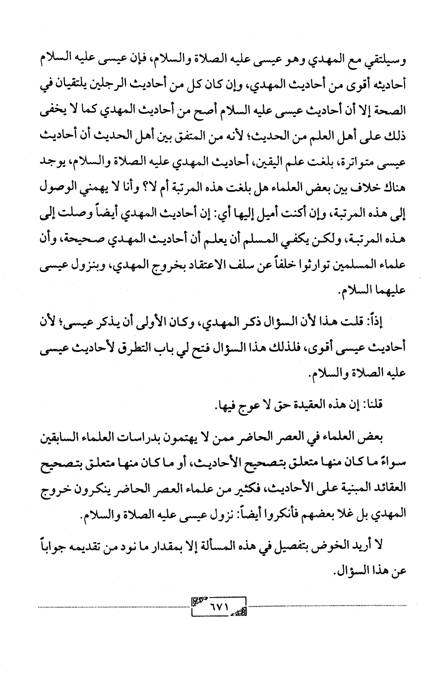 وسيلتقي مع المهدي وهو عيسى عليه الصلاة والسلام، فإن عيسى عليه السلام أحاديثه أقوى من أحاديث المهدي، وإن كان كل من أحاديث الرجلين يلتقيان في الصحة إلا أن أحاديث عيسى عليه السلام أصح من أحاديث المهدي كما لا يخفى ذلك على أهل العلم من الحديث؛ لأنه من المتفق بين أهل الحديث أن أحاديث عيسى متواترة، بلغت علم اليقين، أحاديث المهدي عليه الصلاة والسلام، يوجد هناك خلاف بين بعض العلماء هل بلغت هذه المرتبة أم لا؟ وأنا لا يهمني الوصول إلى هذه المرتبة، وإن أكنت أميل إليها أي: إن أحاديث المهدي أيضاً وصلت إلى هذه المرتبة، ولكن يكفي المسلم أن يعلم أن أحاديث المهدي صحيحة، وأن علماء المسلمين توارثوا خلفاً عن سلف الاعتقاد بخروج المهدي، وبنزول عيسى عليهما السلام.