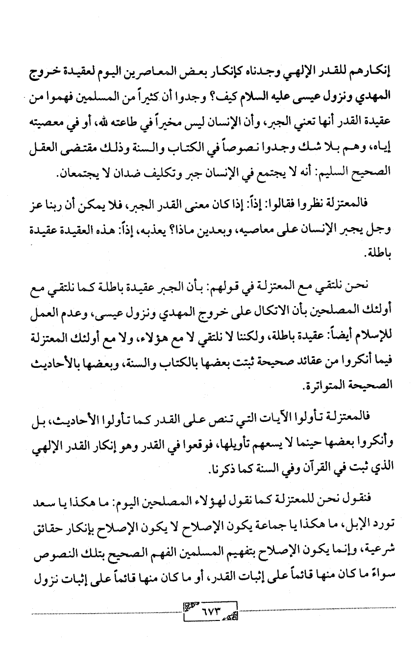 نحن نلتقي مع المعتزلة في قولهم: بأن الجبر عقيدة باطلة كما نلتقي مع أولئك المصلحين بأن الاتكال على خروج المهدي ونزول عيسى، وعدم العمل للإسلام أيضاً: عقيدة باطلة، ولكننا لا نلتقي لا مع هؤلاء، ولا مع أولئك المعتزلة فيما أنكروا من عقائد صحيحة ثبتت بعضها بالكتاب والسنة، وبعضها بالأحاديث الصحيحة المتواترة.