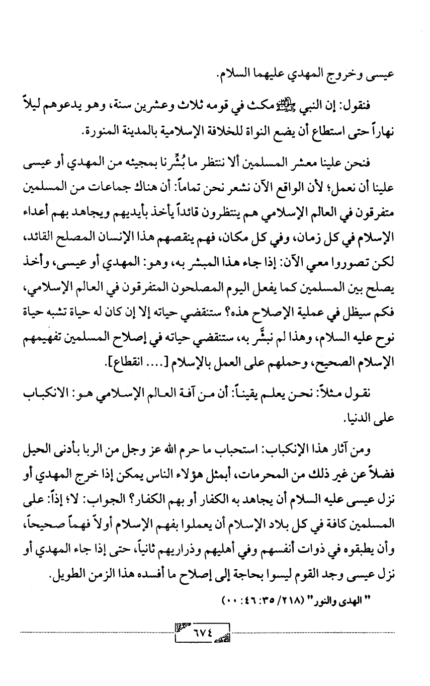فنحن علينا معشر المسلمين ألا ننتظر ما بُشِّرنا بمجيئه من المهدي أو عيسى علينا أن نعمل؛ لأن الواقع الآن نشعر نحن تماماً: أن هناك جماعات من المسلمين متفرقون في العالم الإسلامي هم ينتظرون قائداً يأخذ بأيديهم ويجاهد بهم أعداء الإسلام في كل زمان، وفي كل مكان، فهم ينقصهم هذا الإنسان المصلح القائد، لكن تصوروا معي الآن: إذا جاء هذا المبشر به، وهو: المهدي أو عيسى، وأخذ يصلح بين المسلمين كما يفعل اليوم المصلحون المتفرقون في العالم الإسلامي، فكم سيظل في عملية الإصلاح هذه؟ ستنقضي حياته إلا إن كان له حياة تشبه حياة نوح عليه السلام، وهذا لم نبشَّر به، ستنقضي حياته في إصلاح المسلمين تفهيمهم الإسلام الصحيح، وحملهم على العمل بالإسلام [ .... انقطاع].