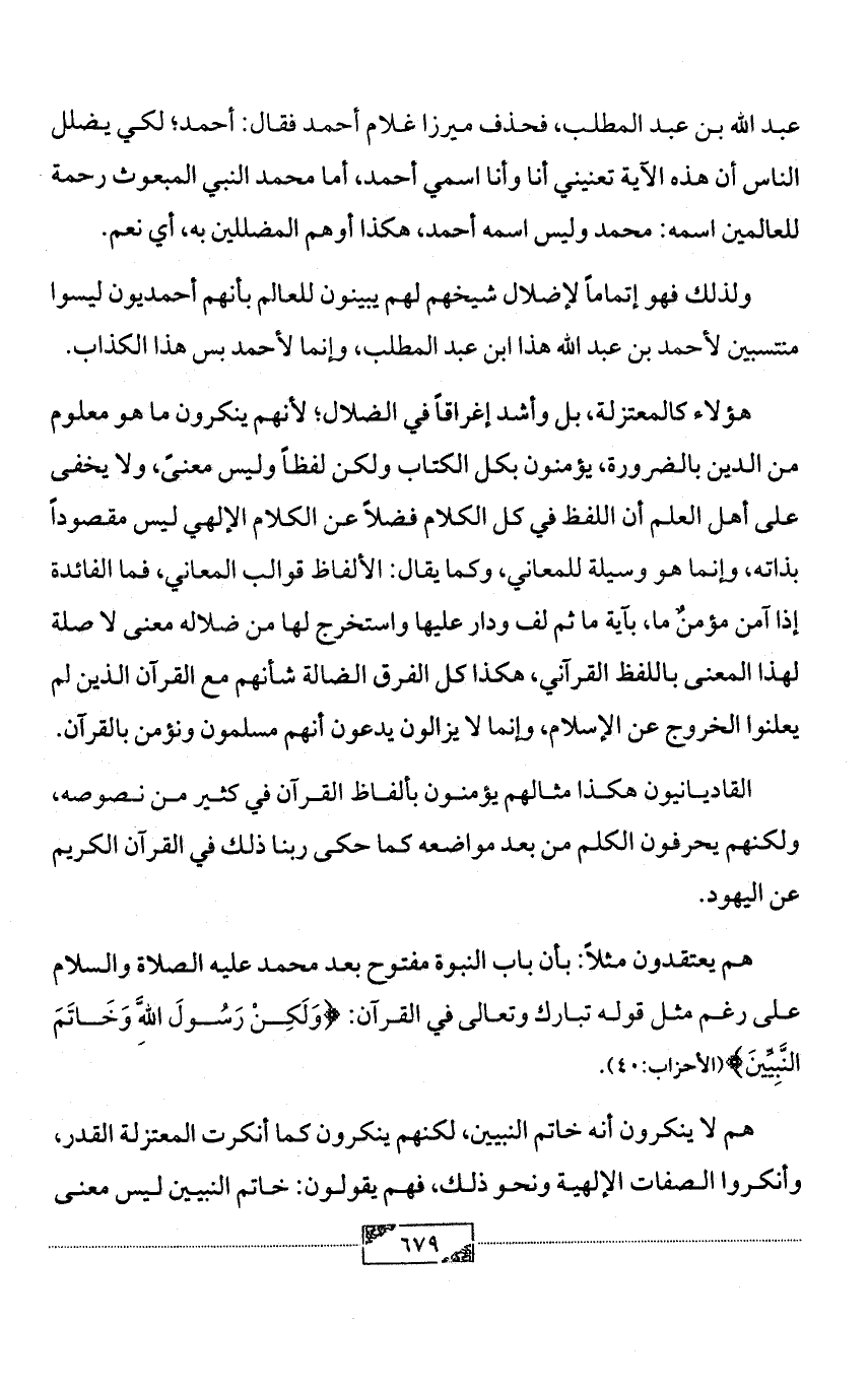 عبد الله بن عبد المطلب، فحذف ميرزا غلام أحمد فقال: أحمد؛ لكي يضلل الناس أن هذه الآية تعنيني أنا وأنا اسمي أحمد، أما محمد النبي المبعوث رحمة للعالمين اسمه: محمد وليس اسمه أحمد، هكذا أوهم المضللين به، أي نعم.