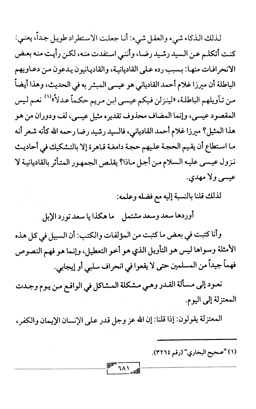 لذلك الذكاء شيء والعقل شيء: أنا جعلت الاستطراد طويل جداً، يعني: كنت أتكلم عن السيد رشيد رضا، وأنني استفدت منه، لكن رأيت منه بعض الانحرافات منها: بسبب رده على القاديانية، والقاديانيون يدعون من دعاويهم الباطلة أن ميرزا غلام أحمد القادياني هو عيسى المبشر به في الحديث، وهذا أيضاً من تآويلهم الباطلة، «لينزلن فيكم عيسى ابن مريم حكماً عدلاً» (¬1) نعم ليس المقصود عيسى، وإنما المضاف محذوف تقديره مثيل عيسى، لف ودوران من هو هذا المثيل؟ ميرزا غلام أحمد القادياني، فالسيد رشيد رضا رحمه الله كأنه شعر أنه ما استطاع أن يقيم الحجة عليهم حجة دامغة قاهرة إلا بالتشكيك في أحاديث نزول عيسى عليه السلام من أجل ماذا؟ يقلص الجمهور المتأثر بالقاديانية لا عيسى ولا مهدي.