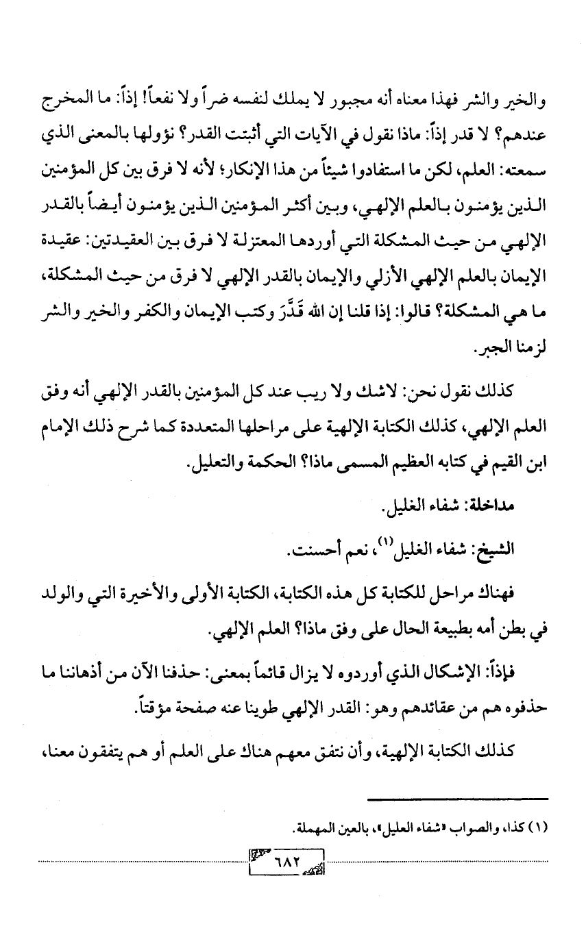 كذلك نقول نحن: لاشك ولا ريب عند كل المؤمنين بالقدر الإلهي أنه وفق العلم الإلهي، كذلك الكتابة الإلهية على مراحلها المتعددة كما شرح ذلك الإمام ابن القيم في كتابه العظيم المسمى ماذا؟ الحكمة والتعليل.