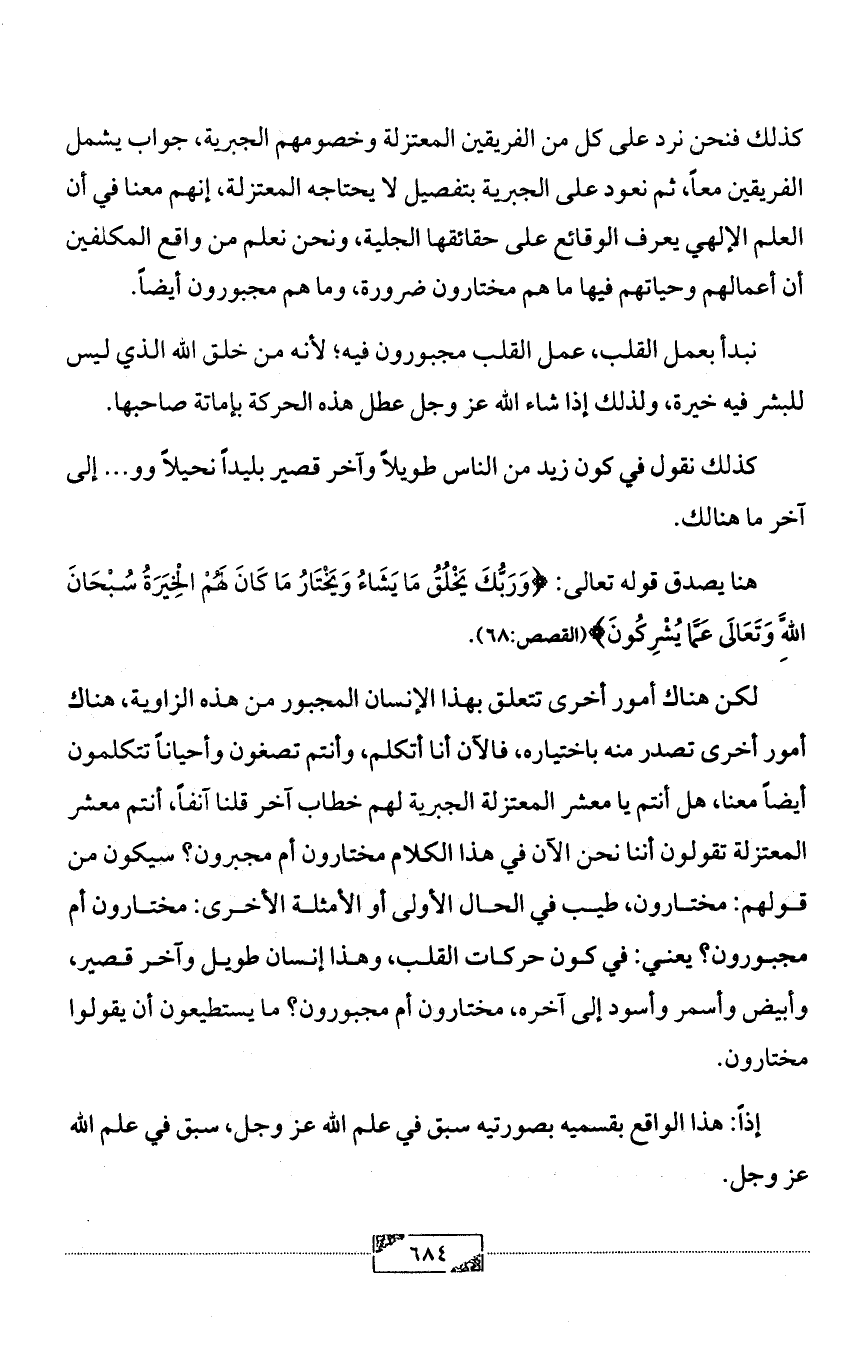 لكن هناك أمور أخرى تتعلق بهذا الإنسان المجبور من هذه الزاوية، هناك أمور أخرى تصدر منه باختياره، فالآن أنا أتكلم، وأنتم تصغون وأحياناً تتكلمون أيضاً معنا، هل أنتم يا معشر المعتزلة الجبرية لهم خطاب آخر قلنا آنفاً، أنتم معشر المعتزلة تقولون أننا نحن الآن في هذا الكلام مختارون أم مجبرون؟ سيكون من قولهم: مختارون، طيب في الحال الأولى أو الأمثلة الأخرى: مختارون أم مجبورون؟ يعني: في كون حركات القلب، وهذا إنسان طويل وآخر قصير، وأبيض وأسمر وأسود إلى آخره، مختارون أم مجبورون؟ ما يستطيعون أن يقولوا مختارون.