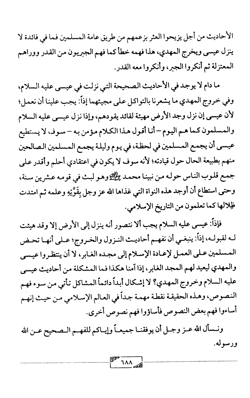 فإذاً: عيسى عليه السلام يجب ألا نتصور أنه ينزل إلى الأرض إلا وقد هيئت له لقبوله، إذاً: ينبغي أن نفهم أحاديث النزول والخروج؛ على أنها تحض المسلمين على العمل لإعادة الإسلام إلى مجده الغابر، لا أن ينتظروا عيسى والمهدي ليعيد لهم المجد الغابر، إذا آمنا هكذا فما المشكلة من أحاديث عيسى عليه السلام وخروج المهدي؟ لا إشكال أبداً دائماً المشاكل تأتي من سوء فهم النصوص، وهذه الحقيقة نقطة مهمة جداً في العالم الإسلامي من حيث إنهم أساءوا فهم بعض النصوص فأساؤوا فهم نصوص أخرى.