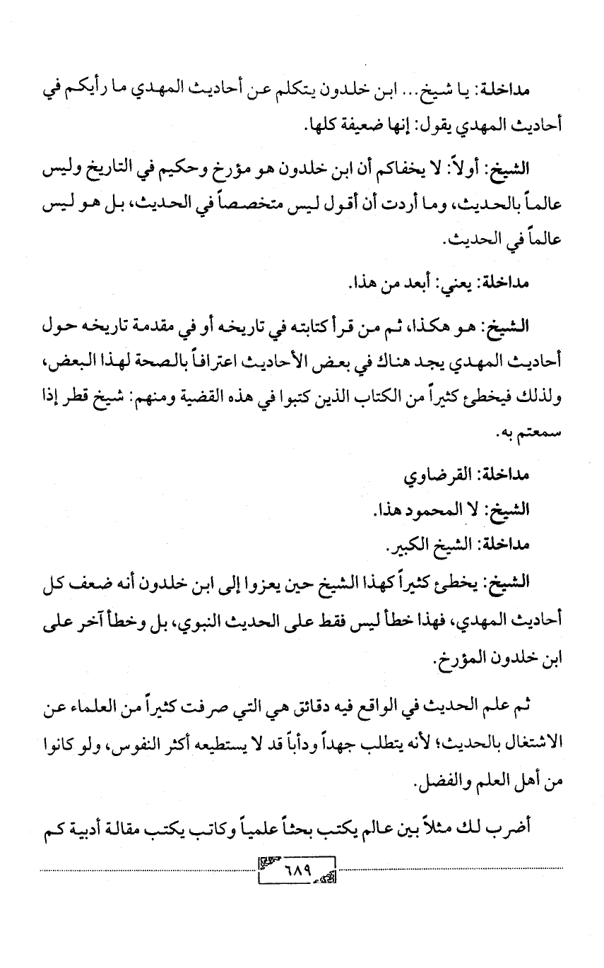 مداخلة: يا شيخ ... ابن خلدون يتكلم عن أحاديث المهدي ما رأيكم في أحاديث المهدي يقول: إنها ضعيفة كلها.