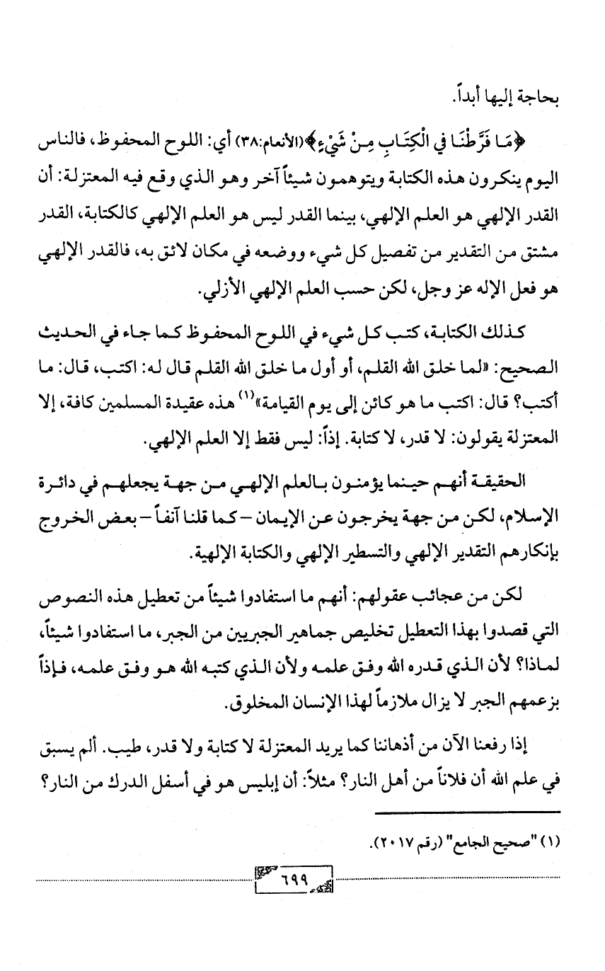 {مَا فَرَّطْنَا في الْكِتَابِ مِنْ شَيْءٍ} (الأنعام:38) أي: اللوح المحفوظ، فالناس اليوم ينكرون هذه الكتابة ويتوهمون شيئاً آخر وهو الذي وقع فيه المعتزلة: أن القدر الإلهي هو العلم الإلهي، بينما القدر ليس هو العلم الإلهي كالكتابة، القدر مشتق من التقدير من تفصيل كل شيء ووضعه في مكان لائق به، فالقدر الإلهي هو فعل الإله عز وجل، لكن حسب العلم الإلهي الأزلي.