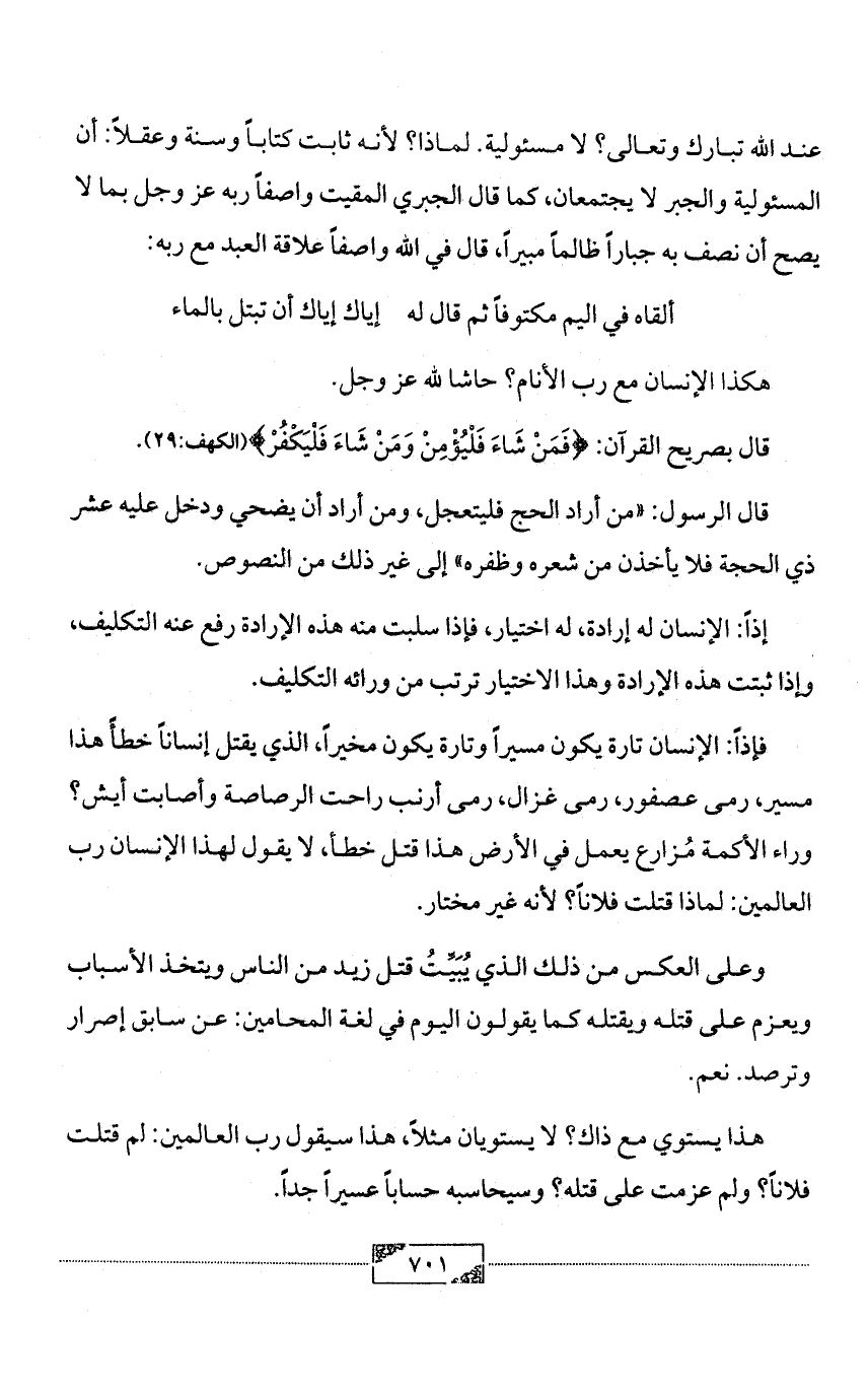 عند الله تبارك وتعالى؟ لا مسئولية. لماذا؟ لأنه ثابت كتاباً وسنة وعقلاً: أن المسئولية والجبر لا يجتمعان، كما قال الجبري المقيت واصفاً ربه عز وجل بما لا يصح أن نصف به جباراً ظالماً مبيراً، قال في الله واصفاً علاقة العبد مع ربه: