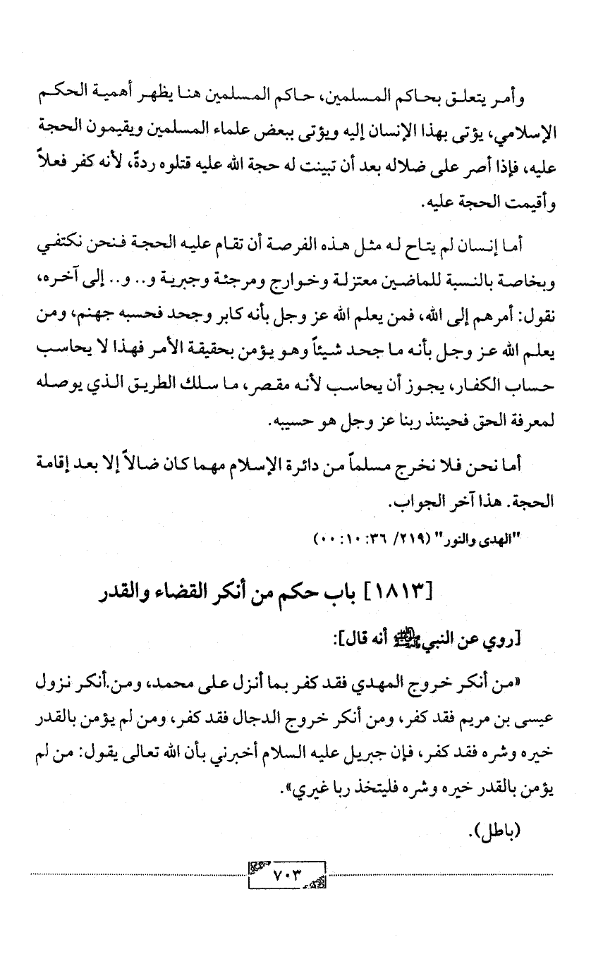 وأمر يتعلق بحاكم المسلمين، حاكم المسلمين هنا يظهر أهمية الحكم الإسلامي، يؤتى بهذا الإنسان إليه ويؤتى ببعض علماء المسلمين ويقيمون الحجة عليه، فإذا أصر على ضلاله بعد أن تبينت له حجة الله عليه قتلوه ردةً، لأنه كفر فعلاً وأقيمت الحجة عليه.