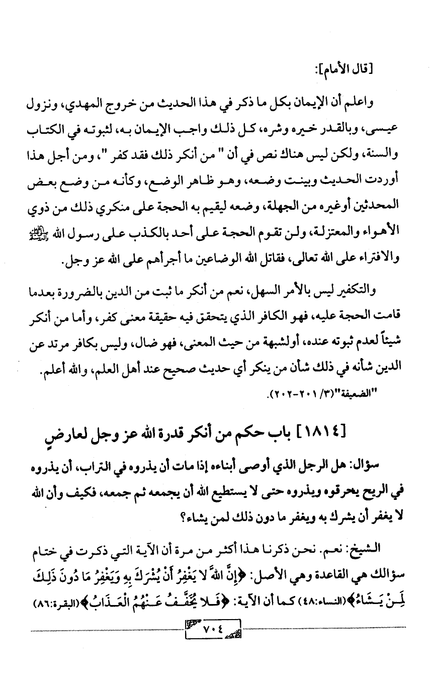 [1814] باب حكم من أنكر قدرة الله عز وجل لعارضٍ