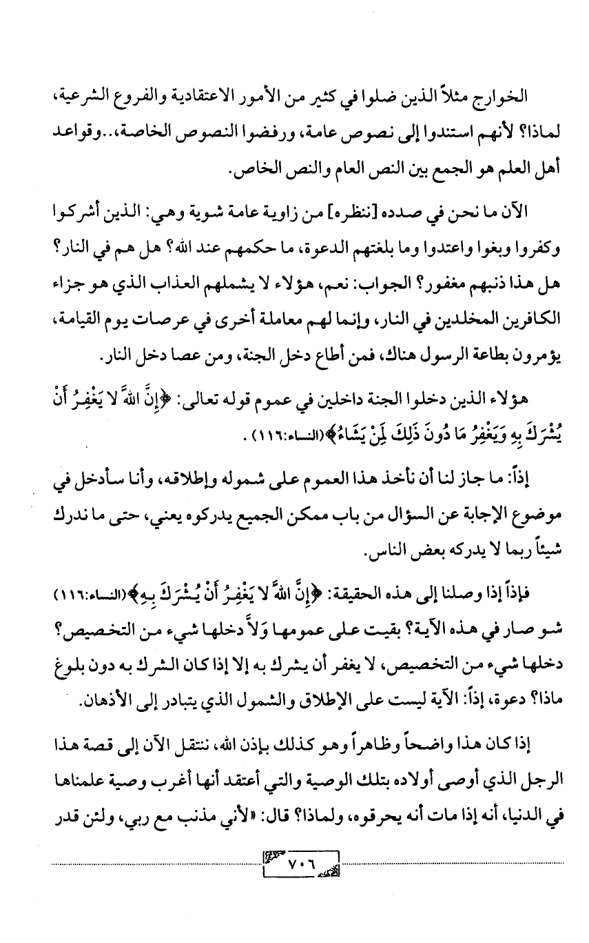 الخوارج مثلاً الذين ضلوا في كثير من الأمور الاعتقادية والفروع الشرعية، لماذا؟ لأنهم استندوا إلى نصوص عامة، ورفضوا النصوص الخاصة، .. وقواعد أهل العلم هو الجمع بين النص العام والنص الخاص.