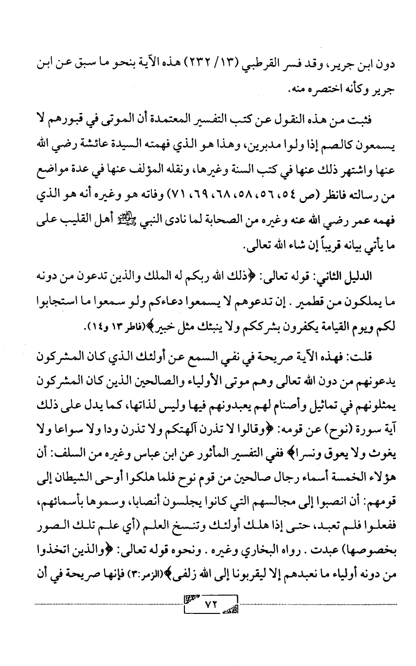 فثبت من هذه النقول عن كتب التفسير المعتمدة أن الموتى في قبورهم لا يسمعون كالصم إذا ولوا مدبرين, وهذا هو الذي فهمته السيدة عائشة رضي الله عنها واشتهر ذلك عنها في كتب السنة وغيرها, ونقله المؤلف عنها في عدة مواضع من رسالته فانظر (ص 54، 56، 58، 68، 69، 71) وفاته هو وغيره أنه هو الذي فهمه عمر رضي الله عنه وغيره من الصحابة لما نادى النبي - صلى الله عليه وآله وسلم - أهل القليب على ما يأتي بيانه قريباً إن شاء الله تعالى.
