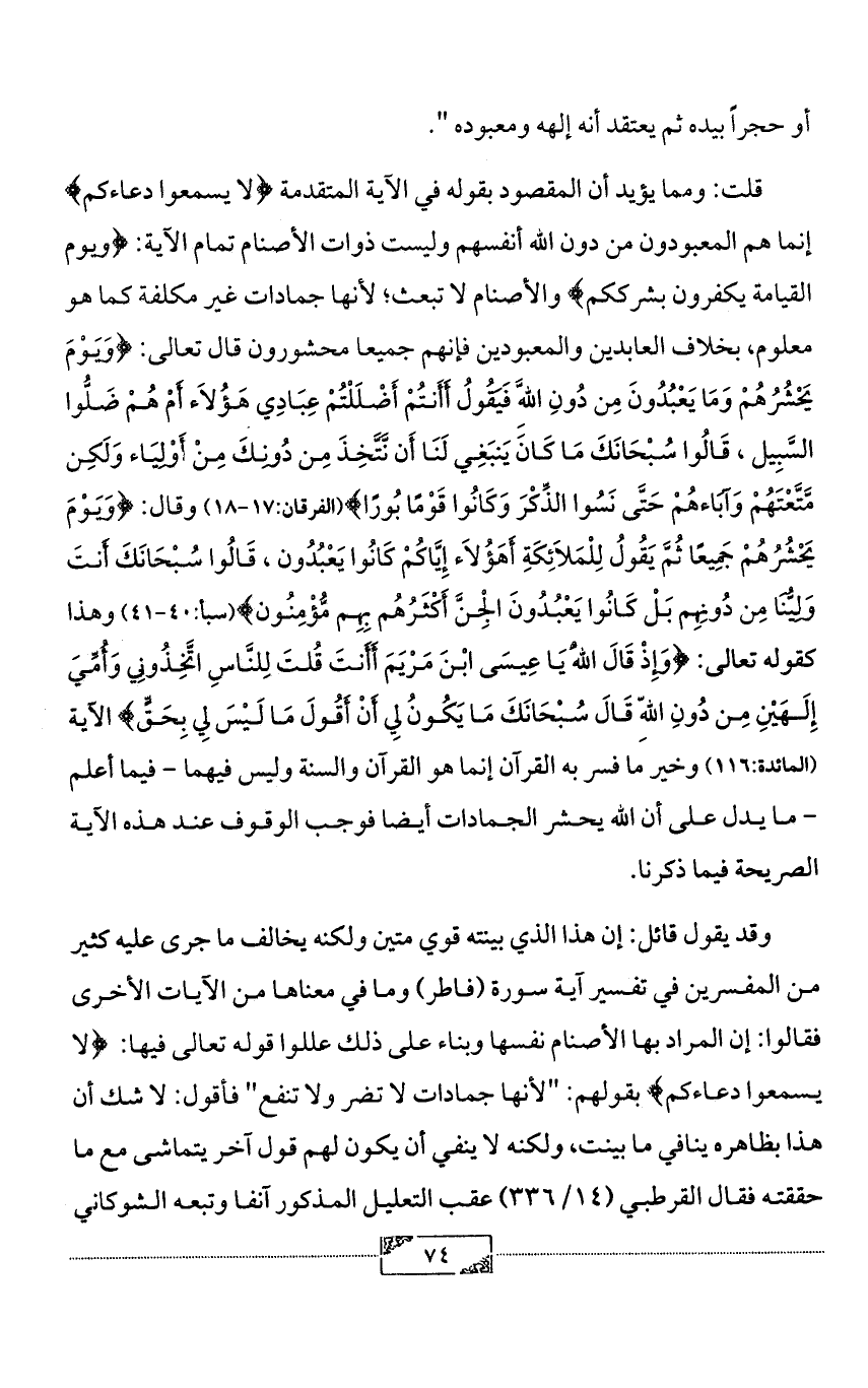 قلت: ومما يؤيد أن المقصود بقوله في الآية المتقدمة {لا يسمعوا دعاءكم} إنما هم المعبودون من دون الله أنفسهم وليست ذوات الأصنام تمام الآية: {ويوم القيامة يكفرون بشرككم} والأصنام لا تبعث؛ لأنها جمادات غير مكلفة كما هو معلوم، بخلاف العابدين والمعبودين فإنهم جميعا محشورون قال تعالى: {وَيَوْمَ يَحْشُرُهُمْ وَمَا يَعْبُدُونَ مِن دُونِ اللَّهِ فَيَقُولُ أَأَنتُمْ أَضْلَلْتُمْ عِبَادِي هَؤُلاَء أَمْ هُمْ ضَلُّوا السَّبِيل، قَالُوا سُبْحَانَكَ مَا كَانَ يَنبَغِي لَنَا أَن نَّتَّخِذَ مِن دُونِكَ مِنْ أَوْلِيَاء وَلَكِن مَّتَّعْتَهُمْ وَآبَاءهُمْ حَتَّى نَسُوا الذِّكْرَ وَكَانُوا قَوْمًا بُورًا} (الفرقان:17 - 18) وقال: {وَيَوْمَ يَحْشُرُهُمْ جَمِيعًا ثُمَّ يَقُولُ لِلْمَلاَئِكَةِ أَهَؤُلاَء إِيَّاكُمْ كَانُوا يَعْبُدُون، قَالُوا سُبْحَانَكَ أَنتَ وَلِيُّنَا مِن دُونِهِم بَلْ كَانُوا يَعْبُدُونَ الْجِنَّ أَكْثَرُهُم بِهِم مُّؤْمِنُون} (سبأ:40 - 41) وهذا كقوله تعالى: {وَإِذْ قَالَ اللهُ يَا عِيسَى ابْنَ مَرْيَمَ أَأَنتَ قُلتَ لِلنَّاسِ اتَّخِذُونِي وَأُمِّيَ إِلَهَيْنِ مِن دُونِ اللهِ قَالَ سُبْحَانَكَ مَا يَكُونُ لِي أَنْ أَقُولَ مَا لَيْسَ لِي بِحَقٍّ} الآية (المائدة:116) وخير ما فسر به القرآن إنما هو القرآن والسنة وليس فيهما - فيما أعلم - ما يدل على أن الله يحشر الجمادات أيضا فوجب الوقوف عند هذه الآية الصريحة فيما ذكرنا.