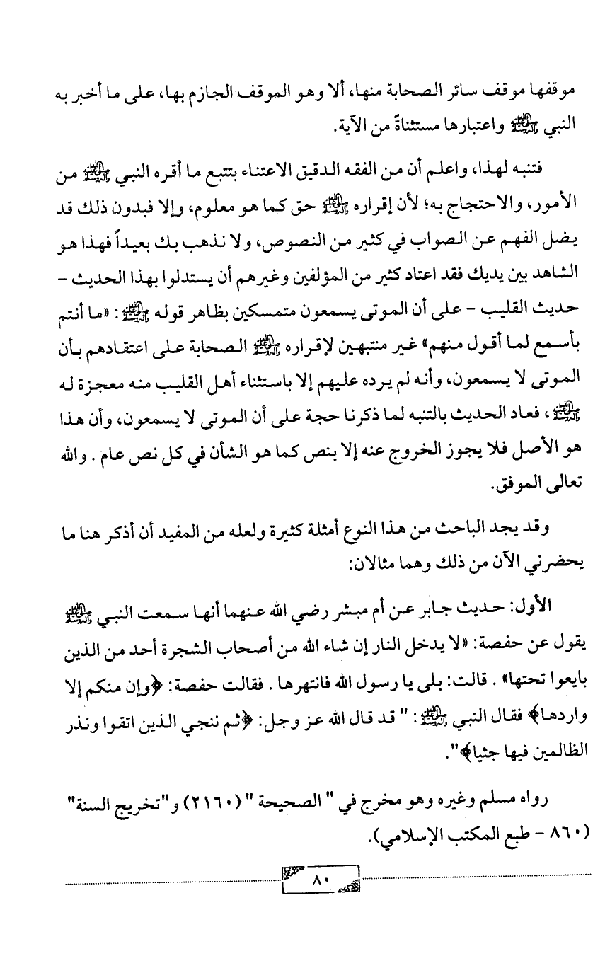 فتنبه لهذا، واعلم أن من الفقه الدقيق الاعتناء بتتبع ما أقره النبي - صلى الله عليه وآله وسلم - من الأمور، والاحتجاج به؛ لأن إقراره - صلى الله عليه وآله وسلم - حق كما هو معلوم، وإلا فبدون ذلك قد يضل الفهم عن الصواب في كثير من النصوص، ولا نذهب بك بعيداً فهذا هو الشاهد بين يديك فقد اعتاد كثير من المؤلفين وغيرهم أن يستدلوا بهذا الحديث - حديث القليب - على أن الموتى يسمعون متمسكين بظاهر قوله - صلى الله عليه وآله وسلم -: «ما أنتم بأسمع لما أقول منهم» غير منتبهين لإقراره - صلى الله عليه وآله وسلم - الصحابة على اعتقادهم بأن الموتى لا يسمعون، وأنه لم يرده عليهم إلا باستثناء أهل القليب منه معجزة له - صلى الله عليه وآله وسلم -، فعاد الحديث بالتنبه لما ذكرنا حجة على أن الموتى لا يسمعون، وأن هذا هو الأصل فلا يجوز الخروج عنه إلا بنص كما هو الشأن في كل نص عام. والله تعالى الموفق.