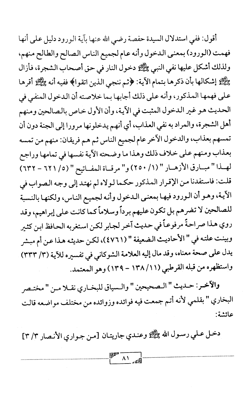 أقول: ففي استدلال السيدة حفصة رضي الله عنها بآية الورود دليل على أنها فهمت (الورود) بمعنى الدخول وأنه عام لجميع الناس الصالح والطالح منهم، ولذلك أشكل عليها نفي النبي - صلى الله عليه وآله وسلم - دخول النار في حق أصحاب الشجرة، فأزال - صلى الله عليه وآله وسلم - إشكالها بأن ذكرها بتمام الآية: {ثم ننجي الذين اتقوا} ففيه أنه - صلى الله عليه وآله وسلم - أقرها على فهمها المذكور، وأنه على ذلك أجابها بما خلاصته أن الدخول المنفي في الحديث هو غير الدخول المثبت في الآية، وأن الأول خاص بالصالحين ومنهم أهل الشجرة، والمراد به نفي العذاب، أي أنهم يدخلونها مرورا إلى الجنة دون أن تمسهم بعذاب، والدخول الآخر عام لجميع الناس ثم هم فريقان: منهم من تمسه بعذاب ومنهم على خلاف ذلك وهذا ما وضحته الآية نفسها في تمامها وراجع لهذا " مبارق الأزهار " (1/ 250) و" مرقاة المفاتيح " (5/ 621 - 632)