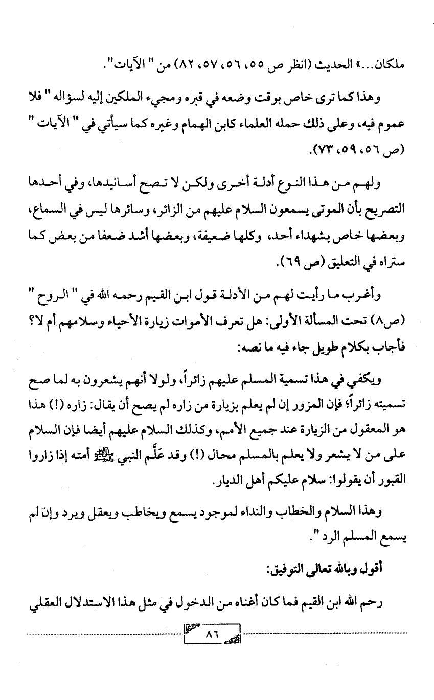 ويكفي في هذا تسمية المسلم عليهم زائراً، ولولا أنهم يشعرون به لما صح تسميته زائراً؛ فإن المزور إن لم يعلم بزيارة من زاره لم يصح أن يقال: زاره (!) هذا هو المعقول من الزيارة عند جميع الأمم، وكذلك السلام عليهم أيضا فإن السلام على من لا يشعر ولا يعلم بالمسلم محال (!) وقد عَلَّم النبي - صلى الله عليه وآله وسلم - أمته إذا زاروا القبور أن يقولوا: سلام عليكم أهل الديار.