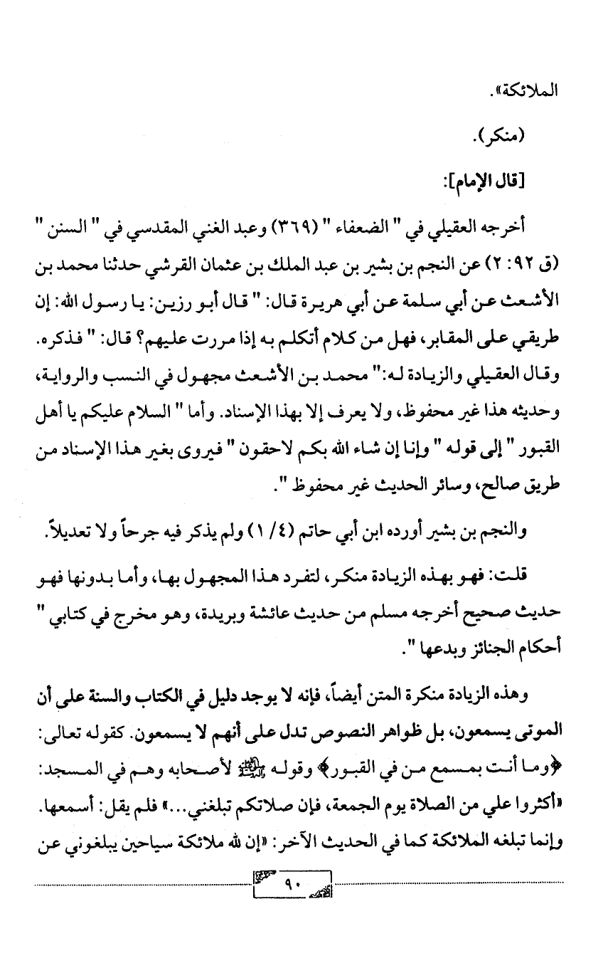 وهذه الزيادة منكرة المتن أيضاً، فإنه لا يوجد دليل في الكتاب والسنة على أن الموتى يسمعون، بل ظواهر النصوص تدل على أنهم لا يسمعون. كقوله تعالى: {وما أنت بمسمع من في القبور} وقوله - صلى الله عليه وآله وسلم - لأصحابه وهم في المسجد: «أكثروا علي من الصلاة يوم الجمعة، فإن صلاتكم تبلغني ... » فلم يقل: أسمعها. وإنما تبلغه الملائكة كما في الحديث الآخر: «إن لله ملائكة سياحين يبلغوني عن