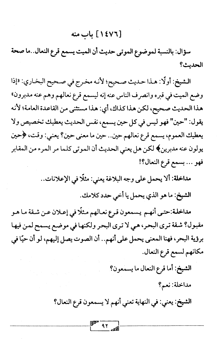 الشيخ: أولًا: هذا حديث صحيح؛ لأنه مخرج في صحيح البخاري: «إذا وضع الميت في قبره وانصرف الناس عنه إنه ليسمع قرع نعالهم وهم عنه مدبرون» هذا الحديث صحيح، لكن هذا كذاك، أي: هذا مستثنى من القاعدة العامة؛ لأنه يقول: "حين" فهو ليس في كل حين يسمع، نفس الحديث يعطيك تخصيص ولا يعطيك العموم، يسمع قرع نعالهم حين .. حين ما معنى حين؟ يعني: وقت، {حين يولون عنه مدبرين} لكن هل يعني الحديث أن الموتى كلما مر المرء من المقابر فهو ... بسمع قرع النعال؟!