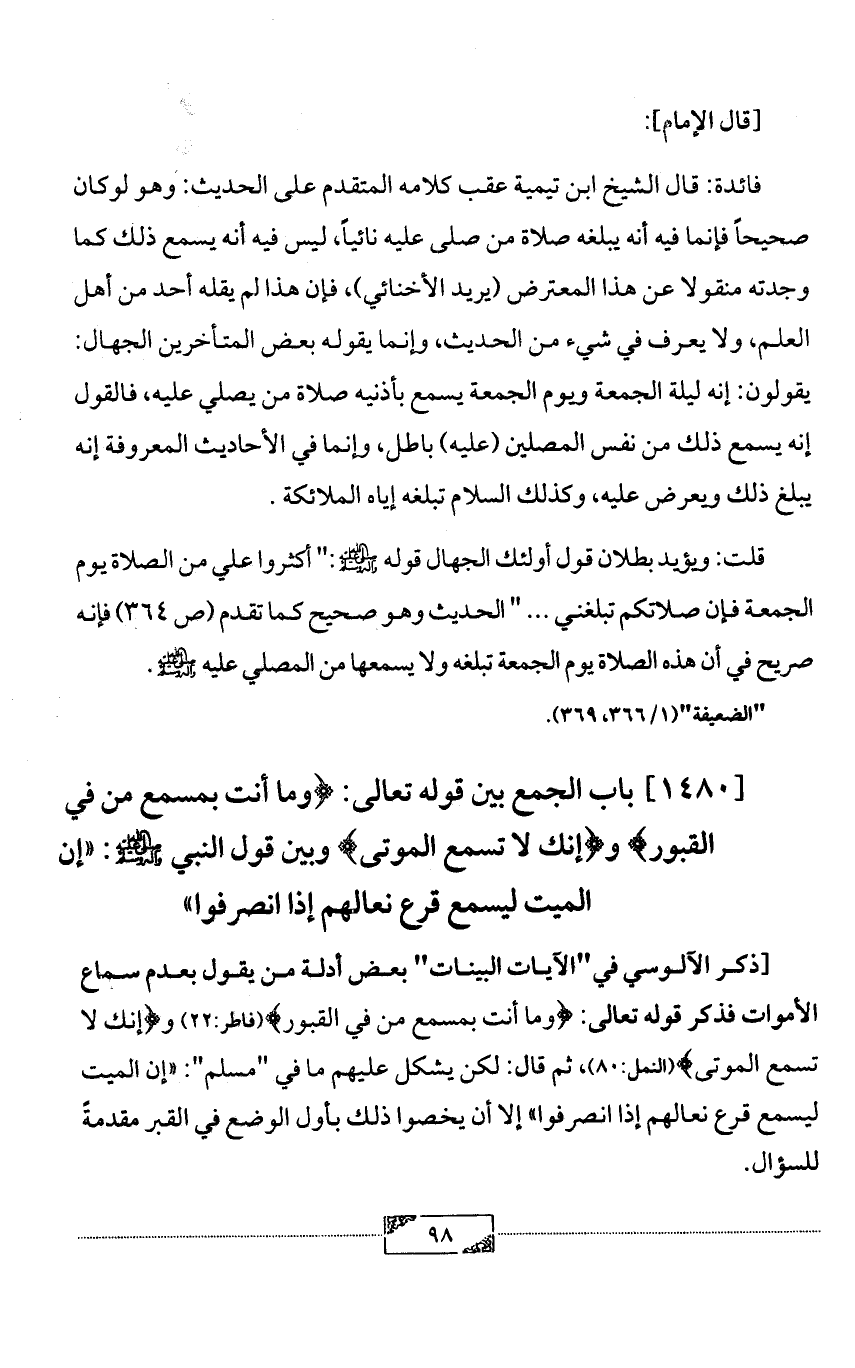 قلت: ويؤيد بطلان قول أولئك الجهال قوله - صلى الله عليه وآله وسلم -:" أكثروا علي من الصلاة يوم الجمعة فإن صلاتكم تبلغني ... " الحديث وهو صحيح كما تقدم (ص 364) فإنه صريح في أن هذه الصلاة يوم الجمعة تبلغه ولا يسمعها من المصلي عليه - صلى الله عليه وآله وسلم -.