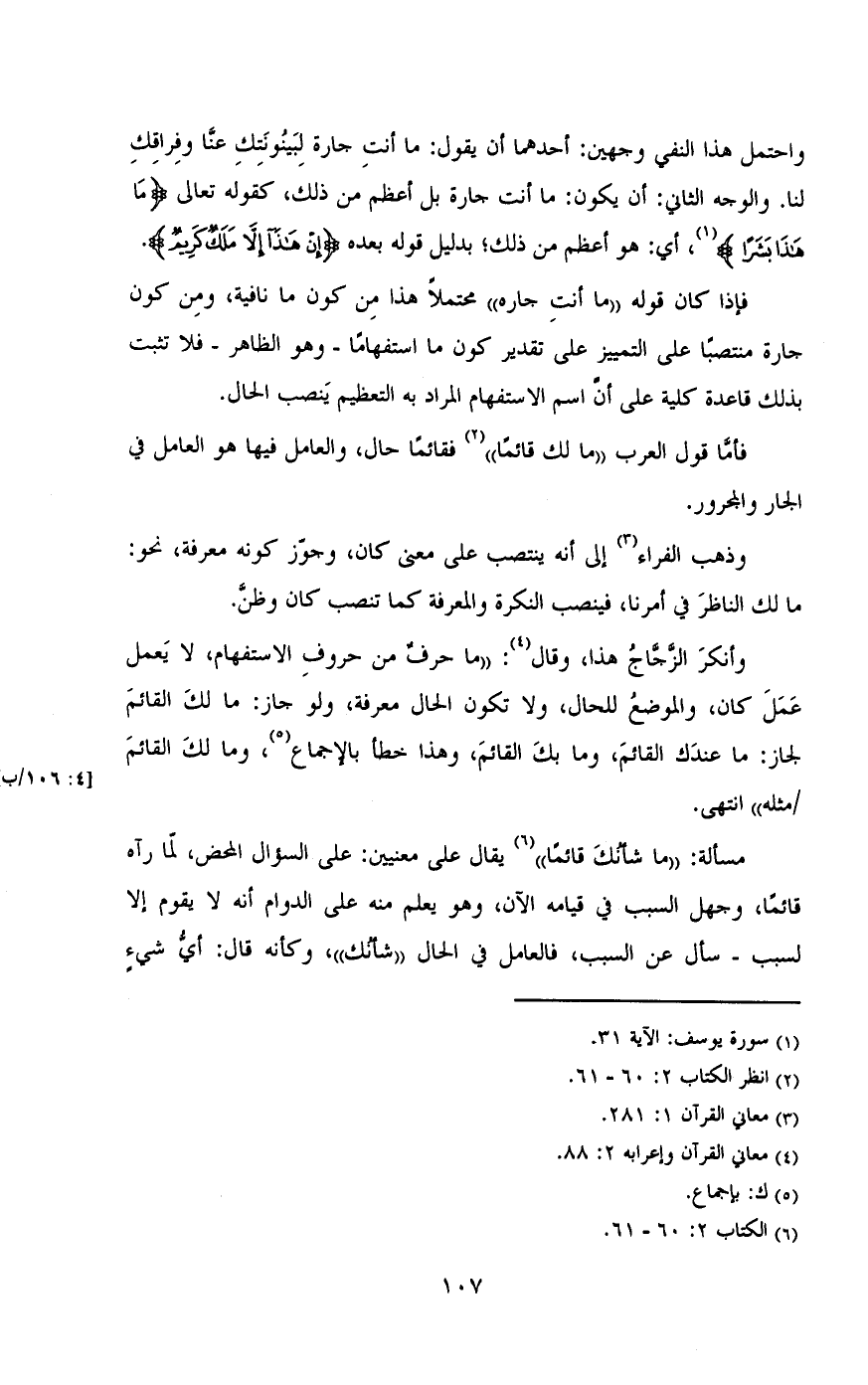 وانكر الزجاج هذا , وقال:» ما حرف من حروف الاستفهام , لا يعمل عمل كان , والموضع للحال , ولا تكون الحال معرفة , لو جاز: ما لك القائم لجاز: ما عندك القائم , وما بك القائم , وهذا خطأ بالإجماع , وما لك القائم / مثله» انتهى.