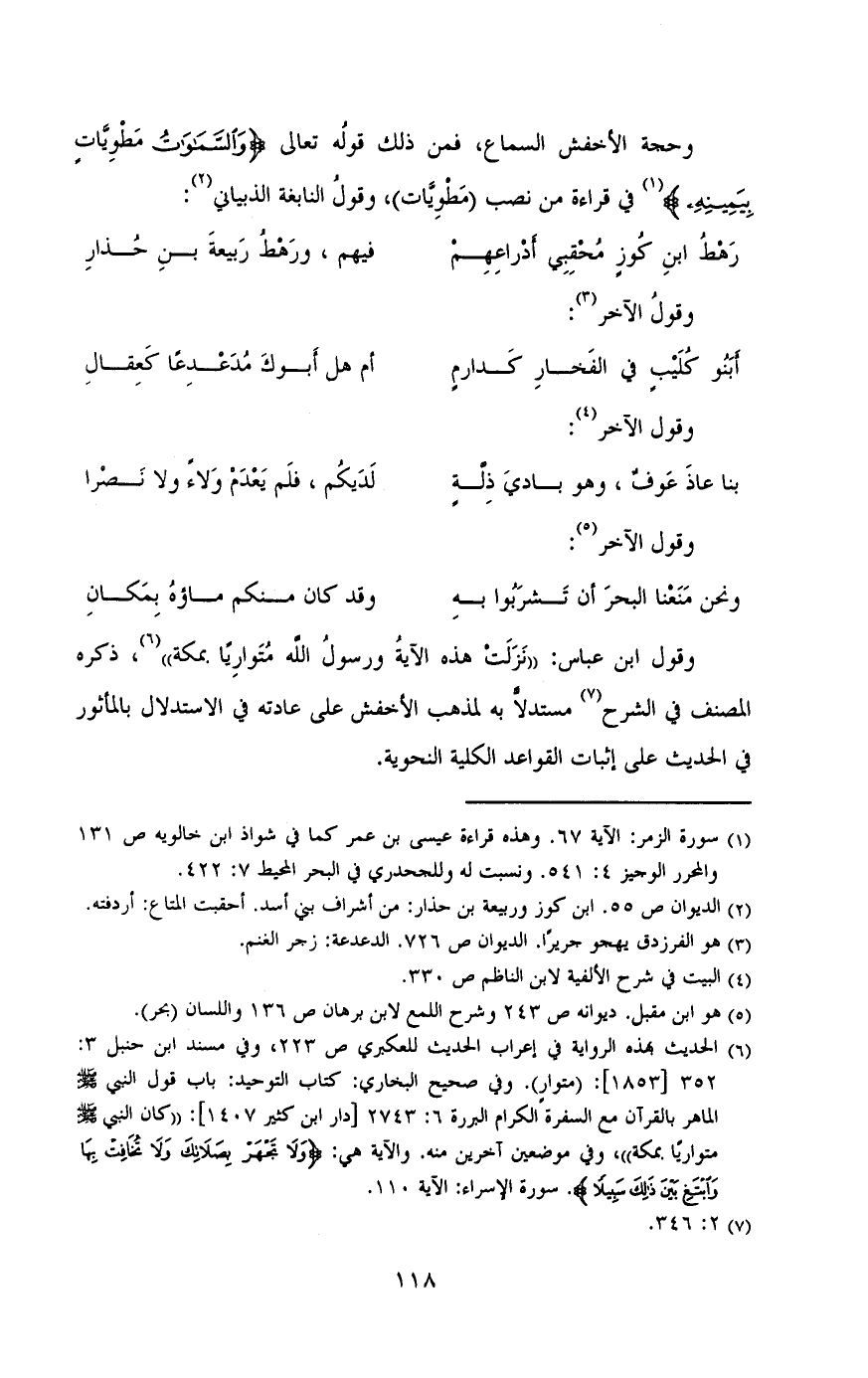 وحجة الأخفش السماع , فمن ذلك قوله تعالى (والسموات مطويات بيمينه) فى قراءة من نصب (مطويات) وقول النباغة الذبيانى: