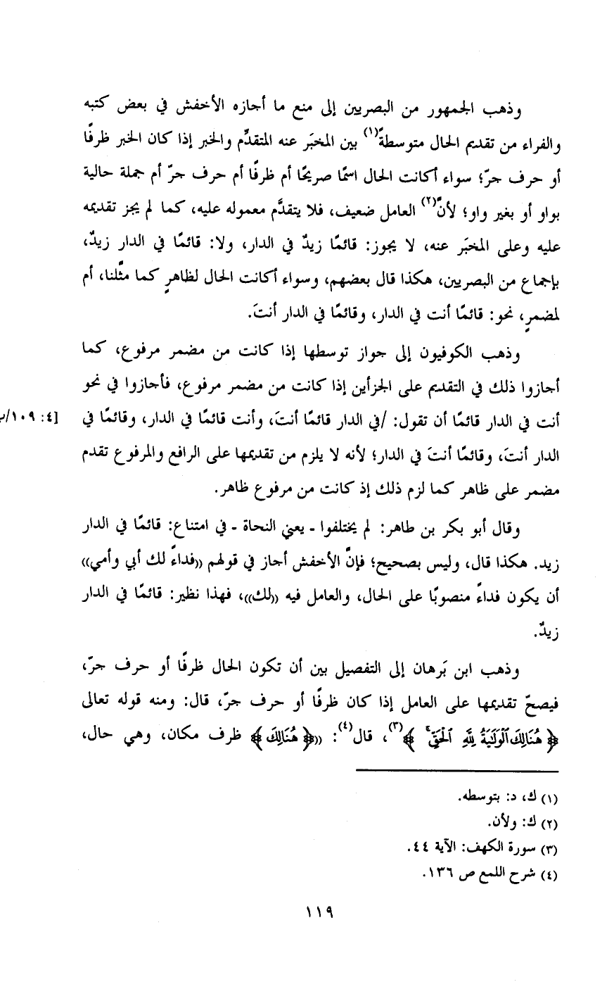 وذهب ابن برهان إلى التفصيل بين أن تكون الحال ظرفا أو حرف جر , فيصح تقديمها على العامل إذا كان ظرفا أو حرف جر , ومنه قوله تعالى (هنالك الولية لله الحق) , قال: (هنالك) ظرف مكان , وهي حال ,