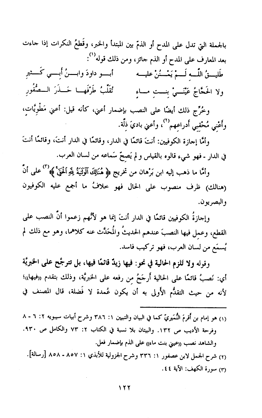 وإجازة الكوفيين قائما فى الدار أنت إنما هو لانهم زعموا أن النصب على القطع ,وعمل فيها النصب عندهم الحديث والمحدث عنه كلاهما ,وهو مع ذلك لم يسمع من لسان العرب , فهو تركيب فاسد.