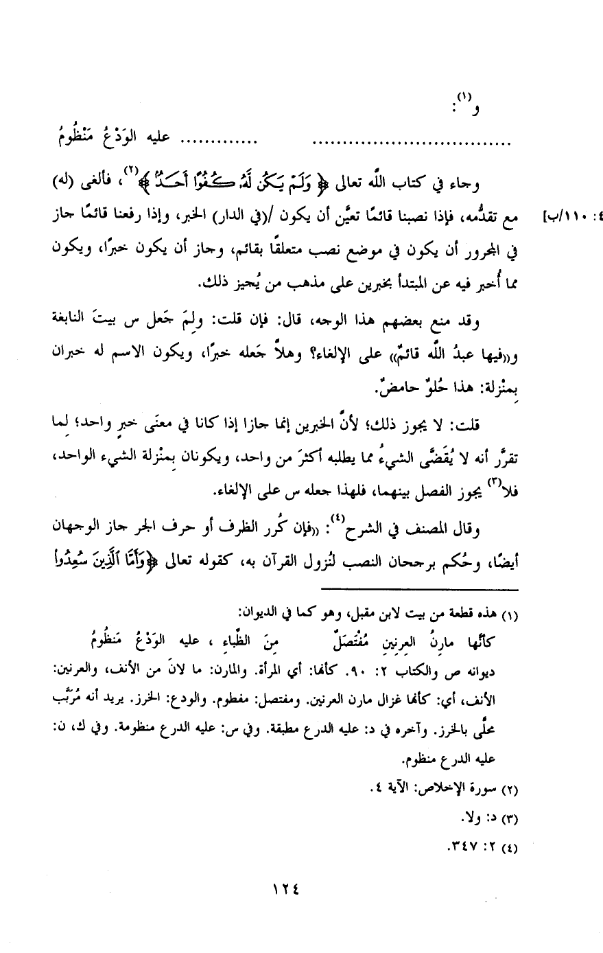 وقد منع بعضهم هذا الوجه , قال: فإن قلت: ولم جعل س بيت النابغة و «فيها عبد الله قائم» على الإلغاء؟ وهلا جعله خبرا , ويكون الاسم له خبران بمنزلة: هذا الحلو حامض.