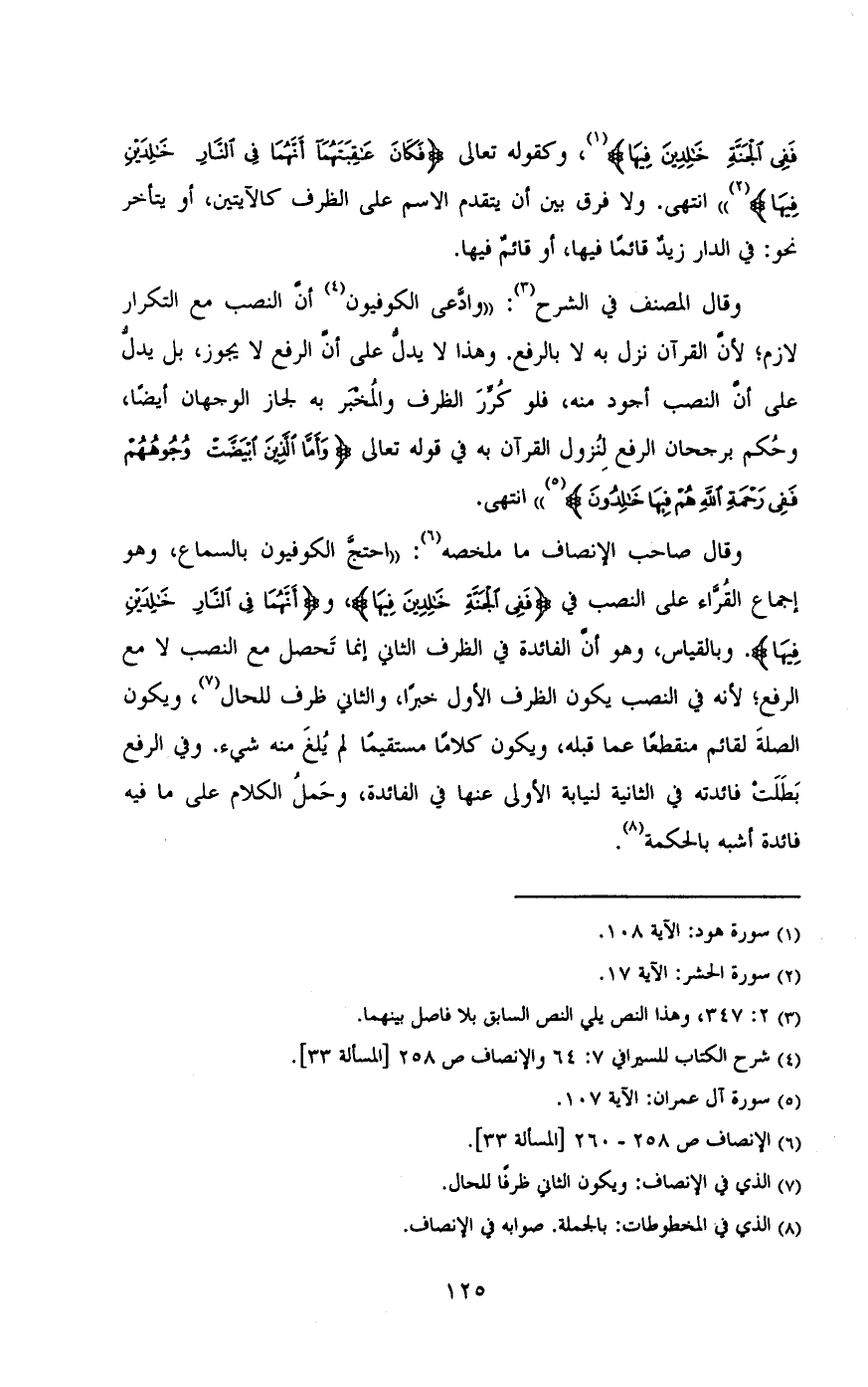 وقال صاحب الانصاب ما ملخصه:» احتج الكوفيون بالسماع , وهو إجماع القراء على النصب فى (ففى الجنة خالدين فيها) و (انهما فى النار خالدين فيها) وبالقياس , وهو أن الفائة فى الظرف الثانى إنما تحصل مع النصب لا مع الرفع , لانه فى النصب يكون الظرف الاول خبرا. والثانى ظرف للحال , ويكون الصلة لقائم منقطعا عما قبله , ويكون كلاما مستقيما لم يلغ منه شئ. وفى الرفع بطلت فائدته فى الثانية لنيابة الاولى عناه فى الفائدة. وحمل الكلام على ما فيه فائدة أشبه بالحكمة